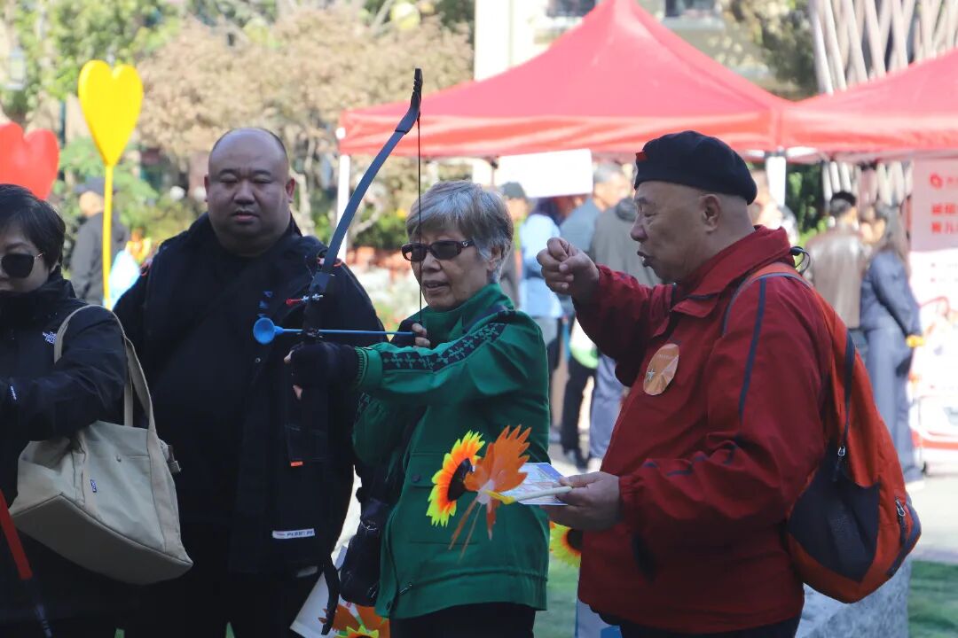 在易州路广场的“金秋乐融区”,射箭游戏排起了长队,军休干部们挽弓射箭,眼神专注,仿佛重回青春岁月。而以百年中山路为背景的复古拍报机前,军休干部纷纷驻足,在志愿者的帮助下拍摄具有老青岛风情的纪念照,留下重阳节的独特记忆。