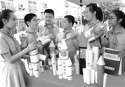 图为五年级三班学生在展示“中国梦航天梦”研究性课题中,同学们制作的我国不同时期航天飞船和火箭模型。