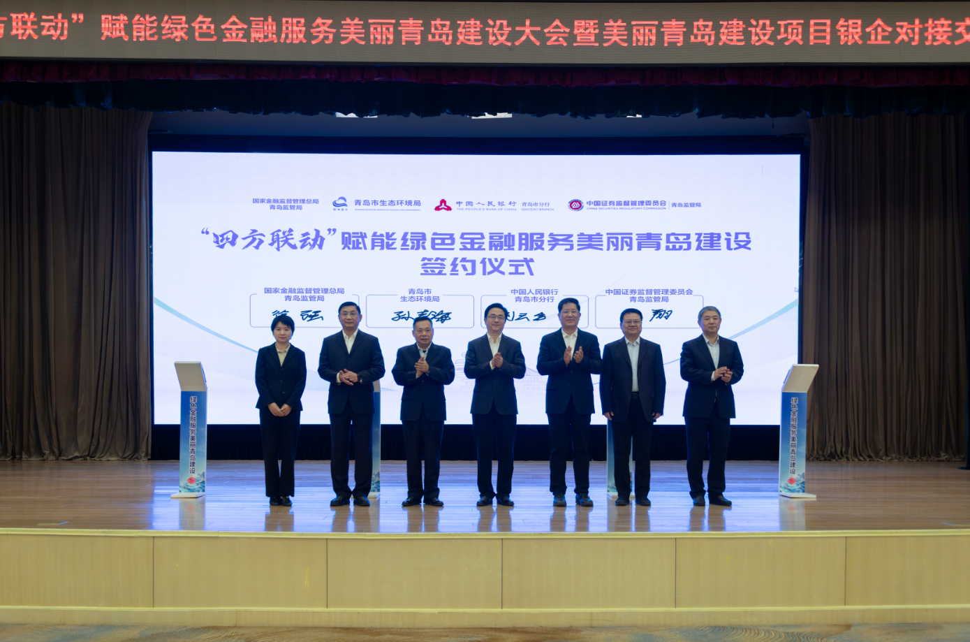 10月29日,“四方联动”赋能绿色金融服务美丽青岛建设大会暨美丽青岛建设项目银企对接交流会在青岛召开。本次会议由青岛市生态环境局、中国人民银行青岛市分行(以下简称人民银行青岛市分行)、国家金融监督管理总局青岛监管局(以下简称青岛金融监管局)、中国证券监督管理委员会青岛监管局(以下简称青岛证监局)“四方”联合举办,协力搭建绿色金融支持美丽青岛建设的高效服务平台,畅通银企对接通道,为美丽青岛建设注入金融“活水”。来自政府部门、30家中资银行机构及部分保险、证券机构,以及各领域企业代表齐聚一堂,以政策赋能、项目对接、签约合作的务实举措,筑牢绿色低碳高质量发展根基。