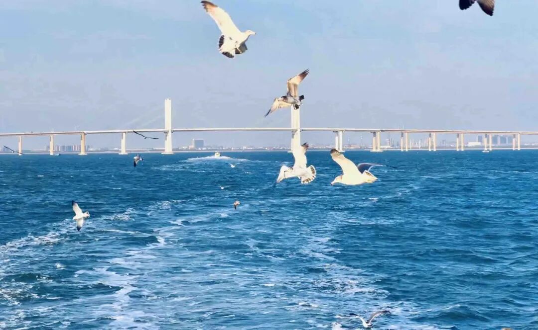 两条新航线各具特色,精准匹配不同游玩需求。其中,“青岛轮渡——海上穿越大桥往返航线”从青岛轮渡码头出发,向北穿越胶州湾大桥至红岛东大洋码头,60分钟航程串联“海上观桥、生态赏鸥、落日奇景”三大核心体验。游客可近距离投喂海鸥,从桥下视角感受跨海大桥的壮阔,返航时还能邂逅“落霞与海鸥齐飞”的“橘子海”美景。