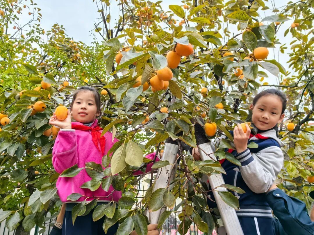 开幕式后,来宾与学生们一同来到柿子树下,共赴秋日丰收之约。大家手持竹篮、礼盒,或踮脚轻摘,或协作配合,小心翼翼地将一个个红如玛瑙的柿子收入篮中。同学们在老师和家长的守护下,兴奋地体验采摘的乐趣,感受着劳动与自然馈赠带来的满满喜悦。