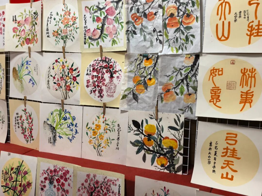 教学楼内的非遗体验区成为了一场流动的文化盛宴。皮影戏摊位前光影摇曳,同学们操控皮影人物演绎故事情节,在幕布后体会民间艺术的灵动;红纸在学生指尖翻转,一张张“柿”形剪纸鲜活灵动,非遗技艺在童心巧手下焕发生机;还有的同学学习茶艺,在茶香中领悟传统文化的雅致;学生手持毛笔,在笔墨晕染间,一个个憨态可掬的“柿柿如意”国画作品诞生……