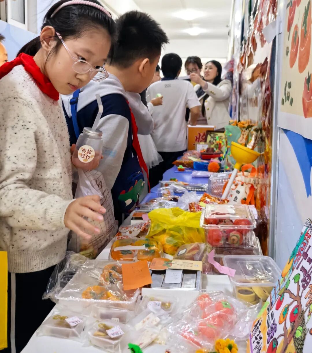 各班精心布置的义卖区域人头攒动,成为校园里最亮丽的风景线。柿子美食区提供的清爽饮品与香甜柿饼备受青睐;手工区陈列着同学们制作的柿子主题书签、黏土摆件等创意作品,精巧别致,吸引大家纷纷驻足;有奖竞猜区欢声笑语不断,展示区里的优秀作品则静静诉说着同学们对秋日的热爱与创造力。整个义卖集市不仅满足了味蕾,更是一次爱心与创造力的交融,洋溢着温馨与欢乐。