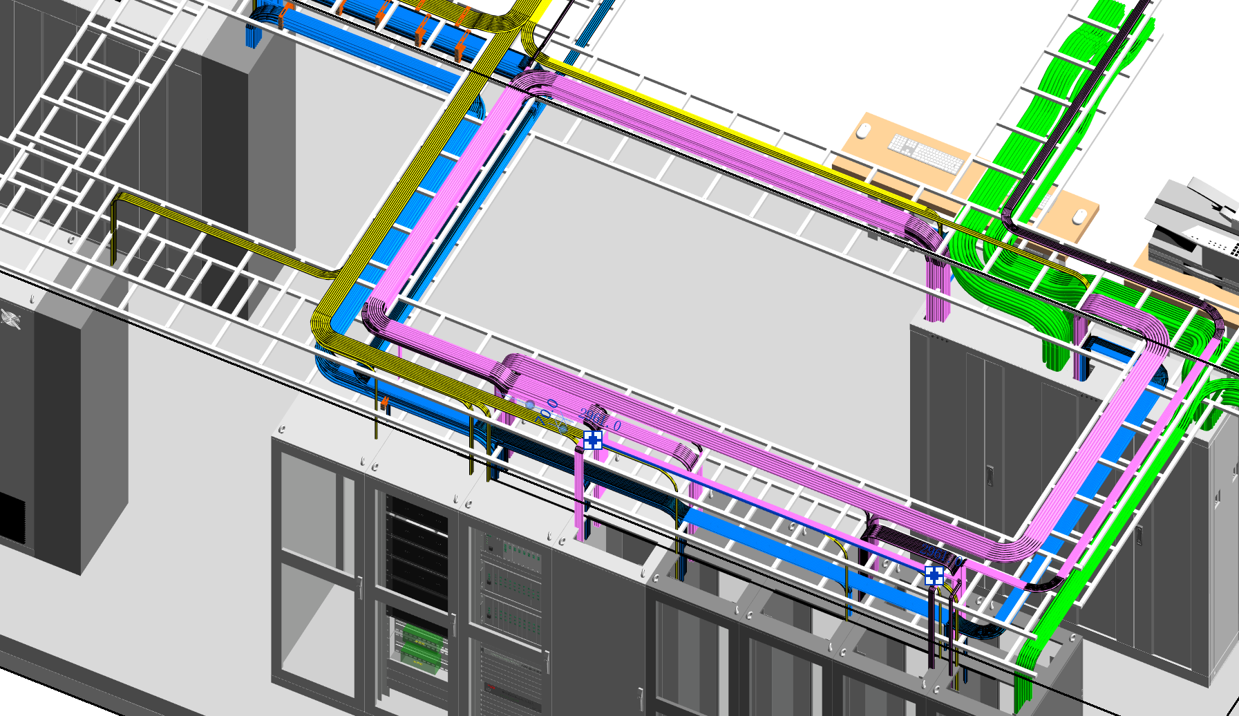经过无数轮“沙盘推演”,最终的BIM模型诞生了。在机柜下线口、纵向与横向桥架交越等复杂节点,通过直观的BIM碰撞试验,反复比对方案,筛选出最优的布线路径,它严格遵循了设备分公司提出的“三线分离”(电源线、地线、控制线分离)等核心原则,每一根线缆的路径、空间位置、顺序都一目了然。
