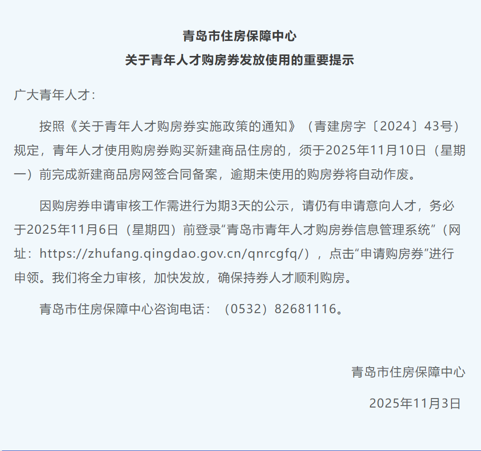 近日,青岛市住房保障中心关于青年人才购房券发放使用发布重要提示。按照《关于青年人才购房券实施政策的通知》规定,青年人才使用购房券购买新建商品住房的,须于2025年11月10日(星期一)前完成新建商品房网签合同备案,逾期未使用的购房券将自动作废。