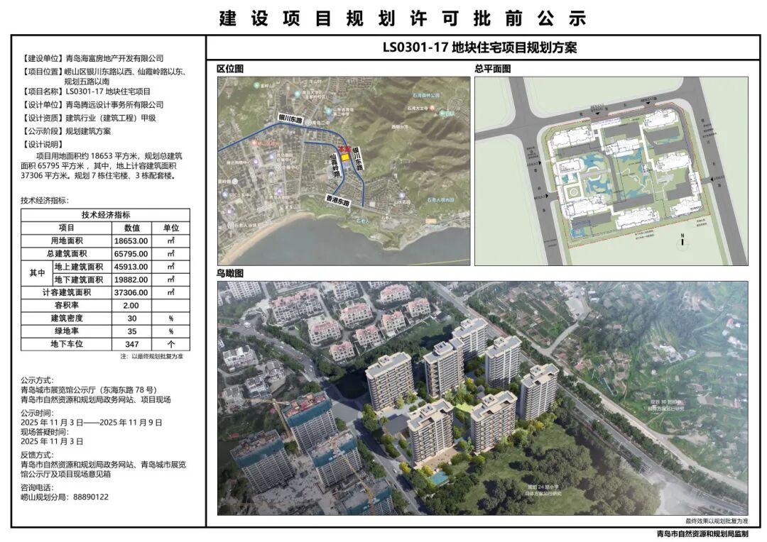 日前,记者获悉,青岛市自然资源和规划局发布了LS0301-17地块住宅项目的规划及建筑方案批前公示,崂山区银川东路沿线将迎来一个总建筑面积超6.5万平方米的高品质住宅社区。