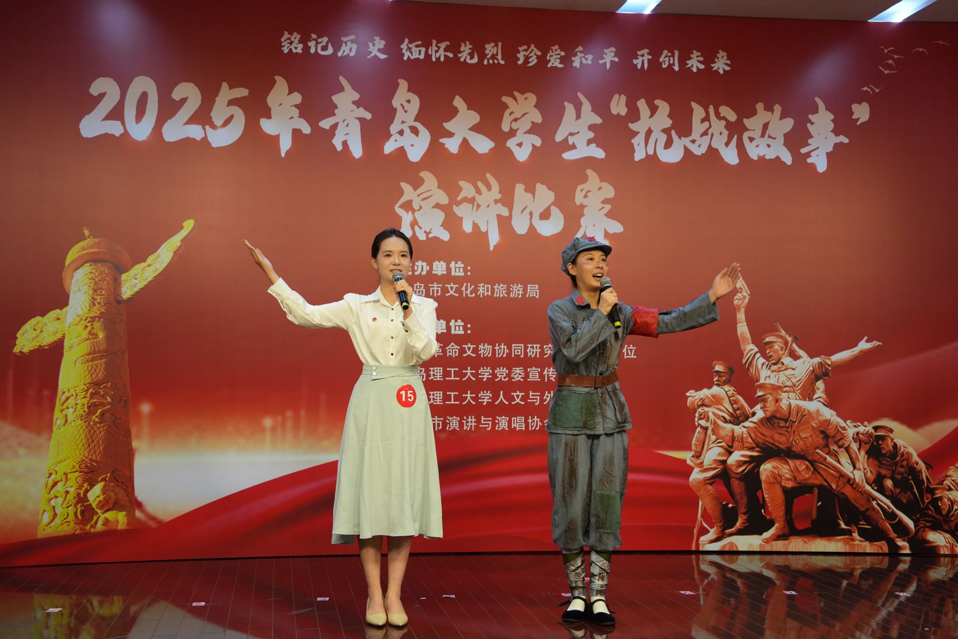 “那枚刻着‘保家卫国’的弹壳,是我母亲的童年玩具,也是太姥爷留下的抗战印记……”青岛电影学院滕术宏同学的讲述,将一段跨越三代的守护娓娓道来;青岛理工大学董锐娴、单骁程同学以双人情景演讲形式,再现“乌斯浑河中的永生”,让“八女投江”的壮烈在当代语境下重焕光芒;青岛科技大学段亚彤带来的《文物未损 精神永存》,则从一件抗战文物的流转中,勾勒出民族记忆的坚韧传承。舞台上,有选手慷慨激昂,重现烽火岁月的铁血忠魂;也有人娓娓道来,讲述战火中不曾湮没的人性微光。一段段被重新擦亮的历史片段,在他们的讲述中变得可感、可触、可共鸣。