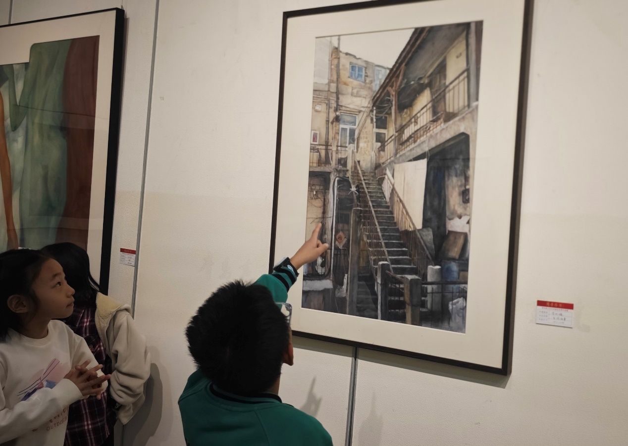 漫步展厅,小记者们被一幅幅精彩的水彩作品所吸引。山东水彩画会会长王绍波老师的《红色之城》以青岛老城区红屋顶为表现对象,大面积明亮丰厚的红色调铺陈画面,在红色阶间以灵动笔墨勾勒出“骨”,再加上大小错落、疏密有致的“留白”,介于写实与抽象之间,以意象表现手法充分发挥水彩画“水色交融”优势,画面精气神十足、气韵生动,小记者们纷纷驻足,赞叹这幅作品的独特魅力。