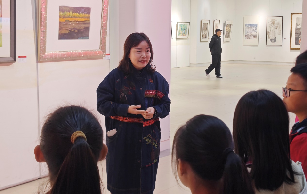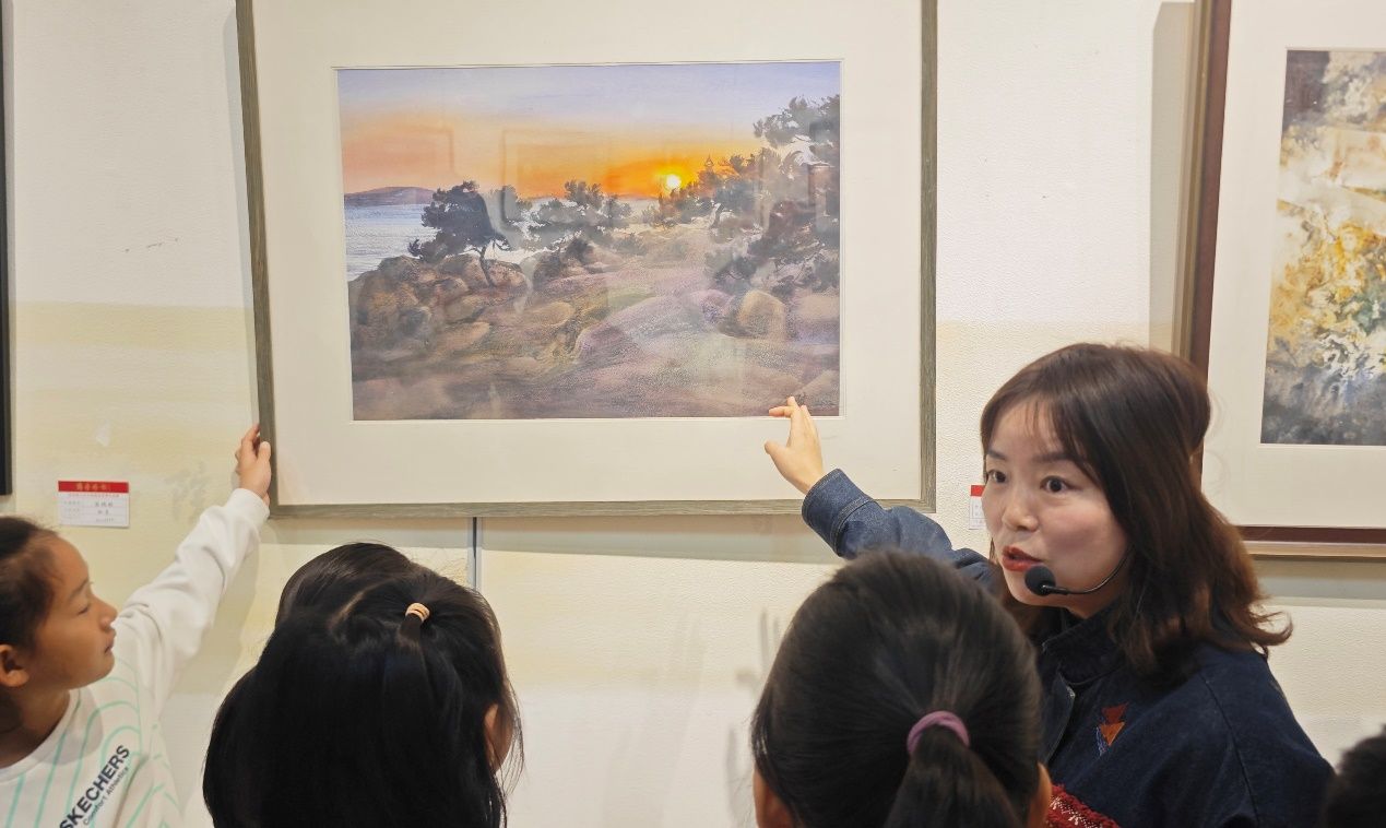 山东水彩画会理事陈瑞娟向小记者们介绍画展。