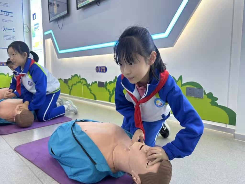 除了用火用电安全,本次培训还构建了更为立体的校园安全防护网。在医疗救护区,学生们在模型上练习了心肺复苏和海姆立克急救法。校园防踩踏教学中,安全导师演示了遭遇拥挤时的“保命姿势”。此外,交通安全、自然灾害避险等项目的实操体验,也进一步丰富了学生们的应急知识库,提升了综合应对突发事件的能力。