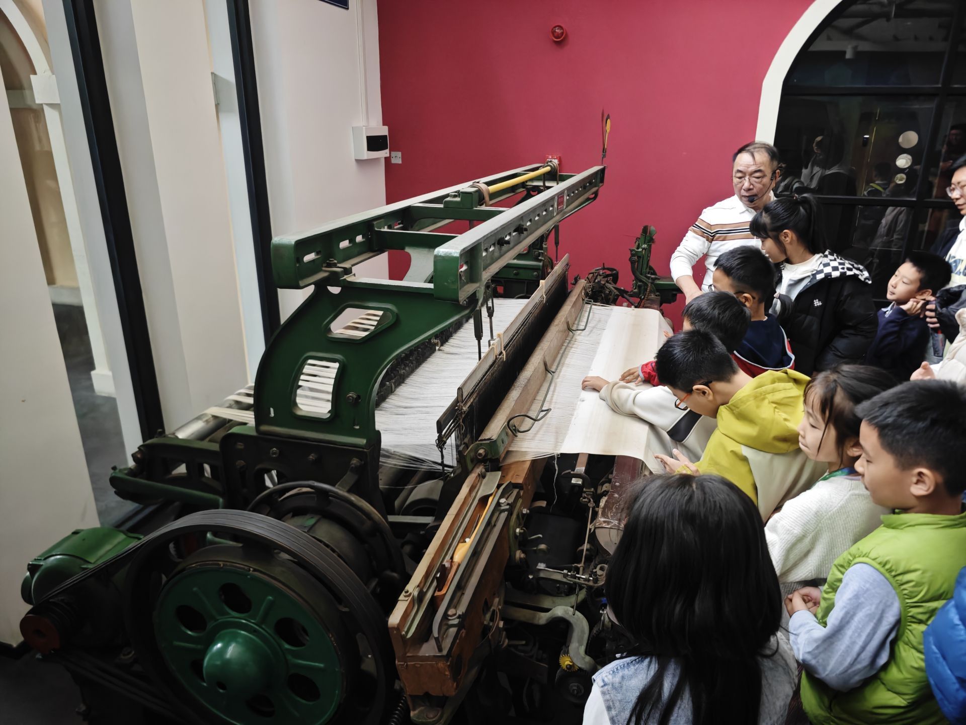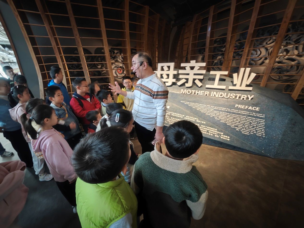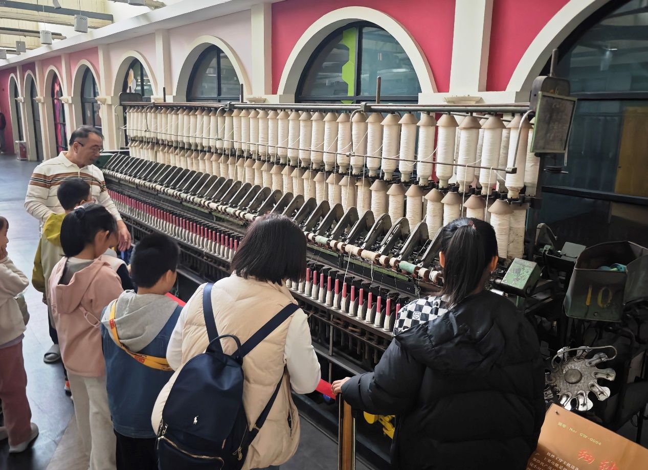 纺织车间展厅是此次研学的“重头戏”。梳棉机、细纱机、并条机、针织圆机、织布机等纺织机械整齐陈列,完美复原了纺织生产全流程。王雷馆长特意在一台1926年的丰田自动换梭机前停下脚步,指着梭子部件详解:“在没有自动换梭技术时,工人每织完一个梭子,都要停机手动更换,不仅效率低,还容易影响布面质量。这台机器实现了自动弹出空梭、换上新梭,为纺织业大规模工业化生产奠定了基础。”看着这台留存着岁月痕迹的老机器,小记者围拢观察,有的轻声询问运转原理,有的认真记录技术革新的意义,深刻体会到 “科技进步对工业发展的巨大推动作用”。