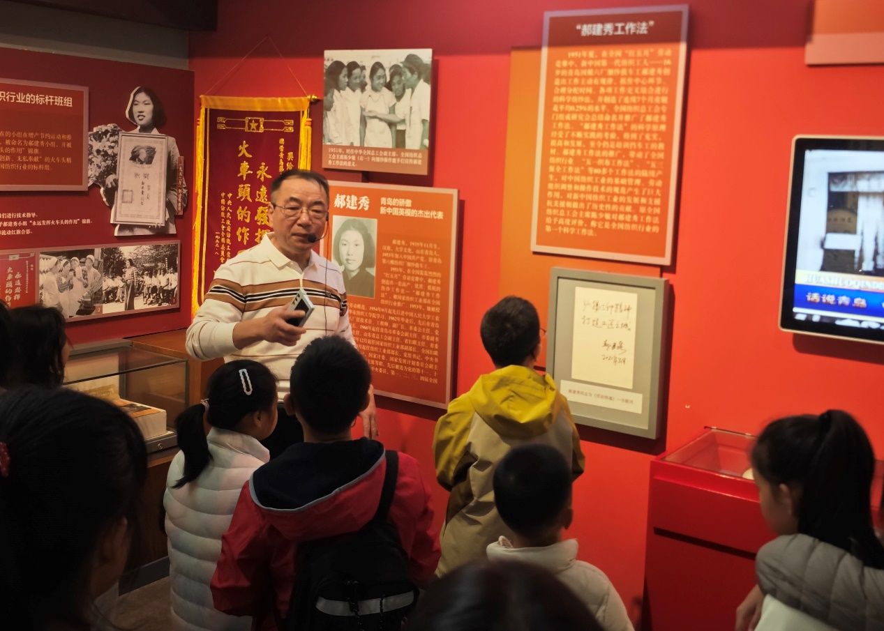 展区内,青岛纺织业的奋斗故事更让小记者深受触动。王雷馆长讲述了“青岛纺织三大巨头”的传奇:周学熙家族接手德华缫丝厂,将其发展为华新纱厂,还为青岛兴建湛山寺;陈孟元创办青岛第一家印染厂,成为《大染房》中“陈六子”的原型,推动青岛印染业起步;隋石卿深耕纺织机械零部件制造与维修,构建起“纺织—印染—维修”的产业闭环。而以郝建秀为代表的纺织劳模故事,更让“火车头精神”变得鲜活——1951年,年轻的郝建秀在纺织劳动竞赛中脱颖而出,创造的“郝建秀工作法”实现高效低耗,她所在的小组被命名为“郝建秀小组”,这种创新拼搏、无私奉献的精神,至今仍在传承。“郝建秀奶奶从普通工人成长为行业楷模,太值得我们学习了!”一名小记者在日记中写下感悟。