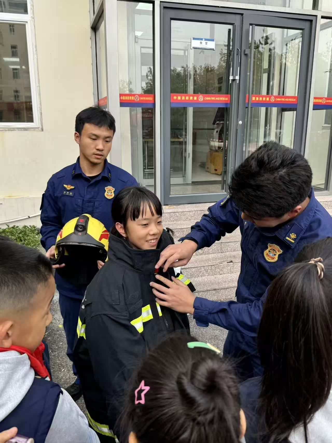 随后,顾凯与同事现场讲解并演示了消防服、消防头盔等个人防护装备的用途和穿戴方法。当得知一套完整的消防设备重量高达20公斤时,同学们深切感受到了消防员肩负的重量与责任。在消防员的帮助下,同学们试穿了专业消防服,亲身体验了“小小消防员”的感觉。