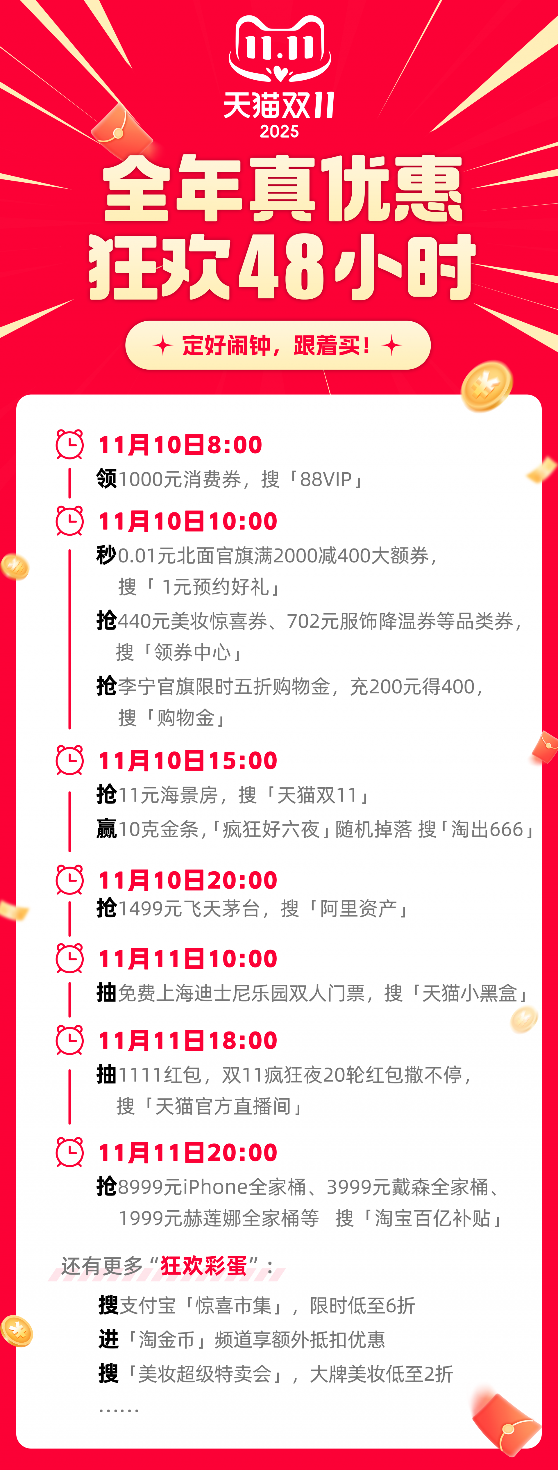 狂欢48小时,定好的每个闹钟,全年真优惠的天猫双11,现货开卖至11月14日24时。