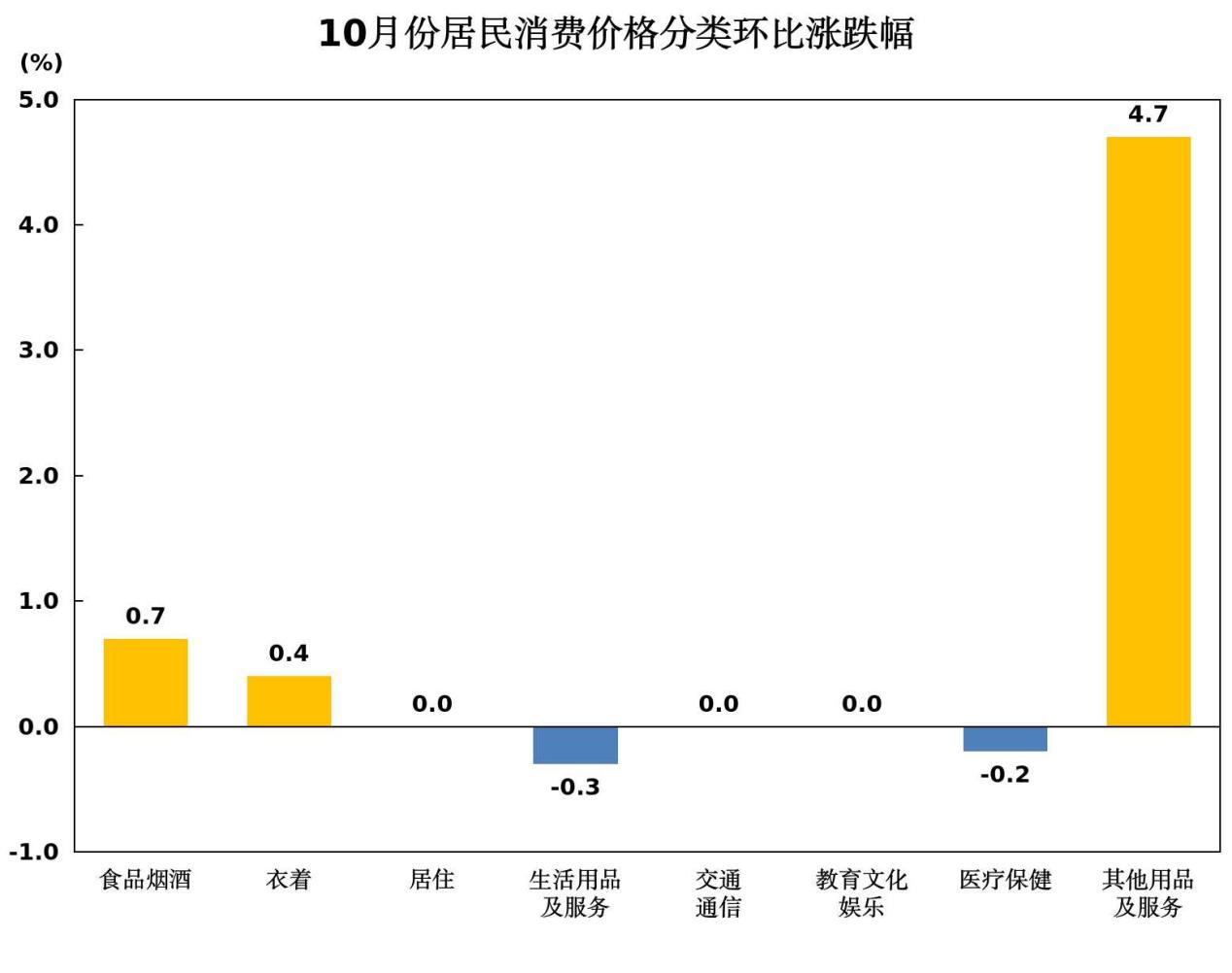 食品烟酒价格环比上涨0.7%,影响CPI上涨约0.18个百分点。其他七大类中,其他用品及服务、衣着价格环比分别上涨4.7%、0.4%;居住、交通通信、教育文化娱乐价格环比持平;生活用品及服务、医疗保健价格环比分别下降0.3%、0.2%。