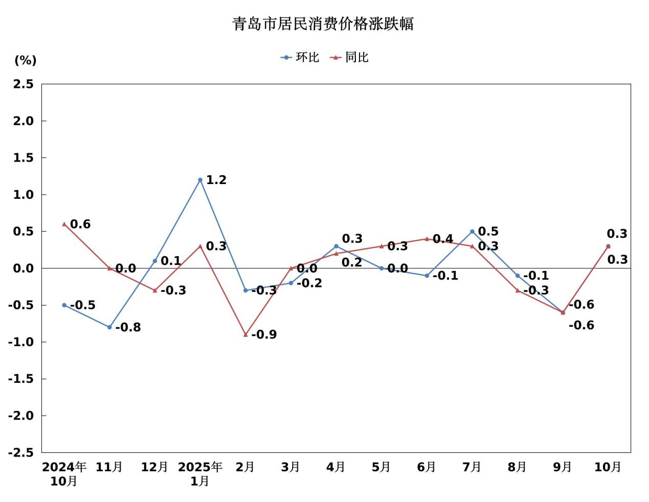 国家统计局青岛调查队监测数据显示,2025年10月,青岛市居民消费价格指数(CPI)环比上涨0.3%,同比上涨0.3%。其中,食品价格同比下降2.2%,非食品价格同比上涨0.8%;消费品价格同比上涨0.3%,服务价格同比上涨0.3%。
