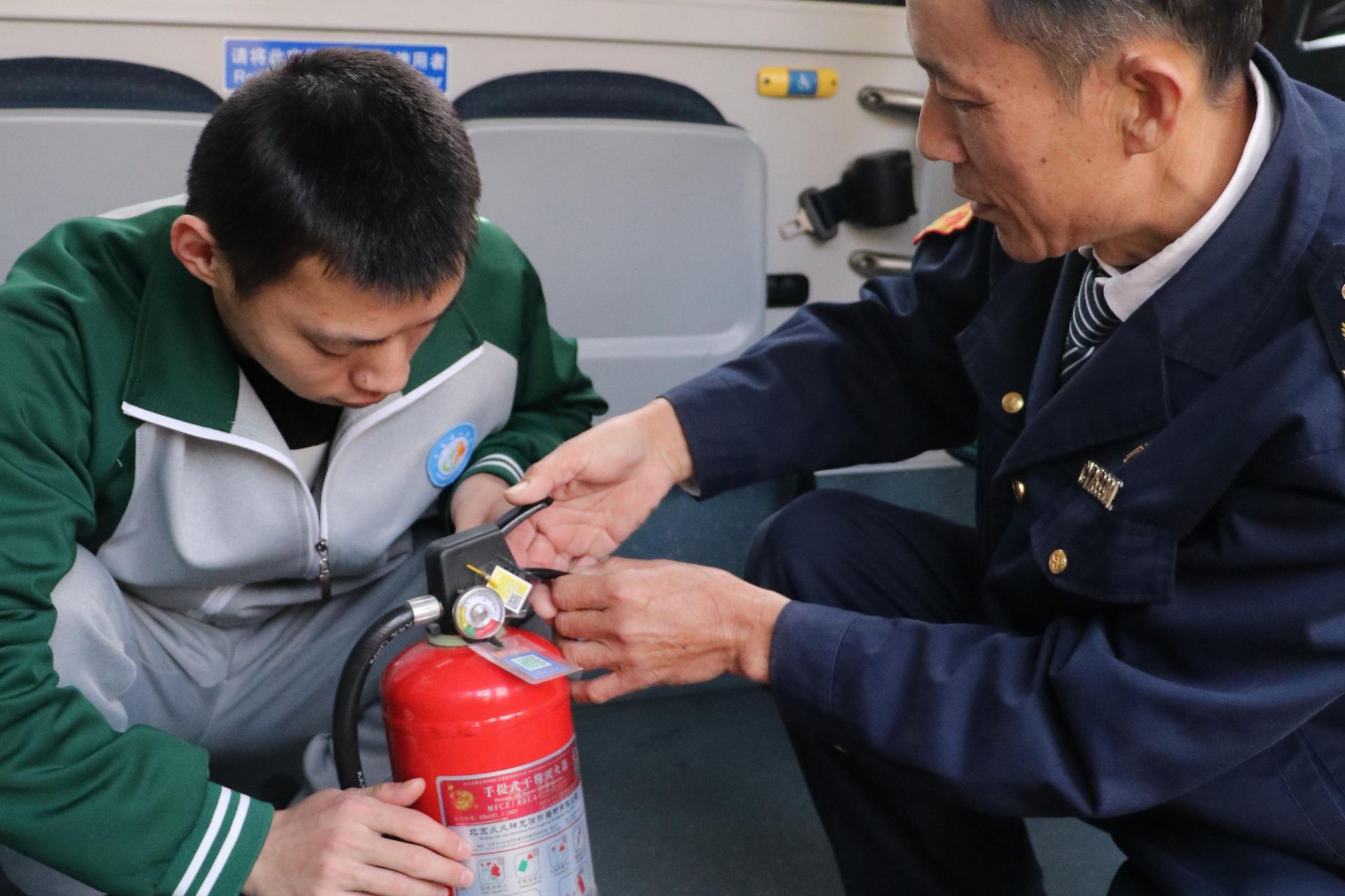 为了让安全知识更易理解、更易掌握,郑吉凡采取了实景教学的方式。他先是示范正确的上下车姿势,叮嘱孩子们要排队有序、不推挤打闹;随后打开公交车的安全锤和应急出口,手把手教孩子们如何识别位置、正确使用,“这是安全锤,遇到危险时可以敲碎车窗逃生,平时可不能随便碰哦”,他一边演示一边耐心解答孩子们的疑问。大家听得认真、学得投入,不时举手提问,课堂氛围十分热烈。