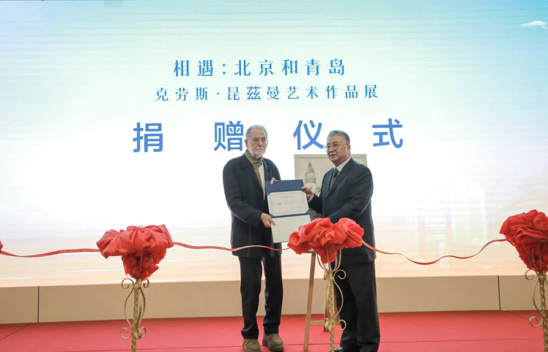 随后,青岛市博物馆理事会理事长杜超代表青岛市博物馆接受捐赠,并向昆兹曼教授颁发捐赠证书及纪念品,感谢其为青岛文化事业留存的珍贵艺术财富。