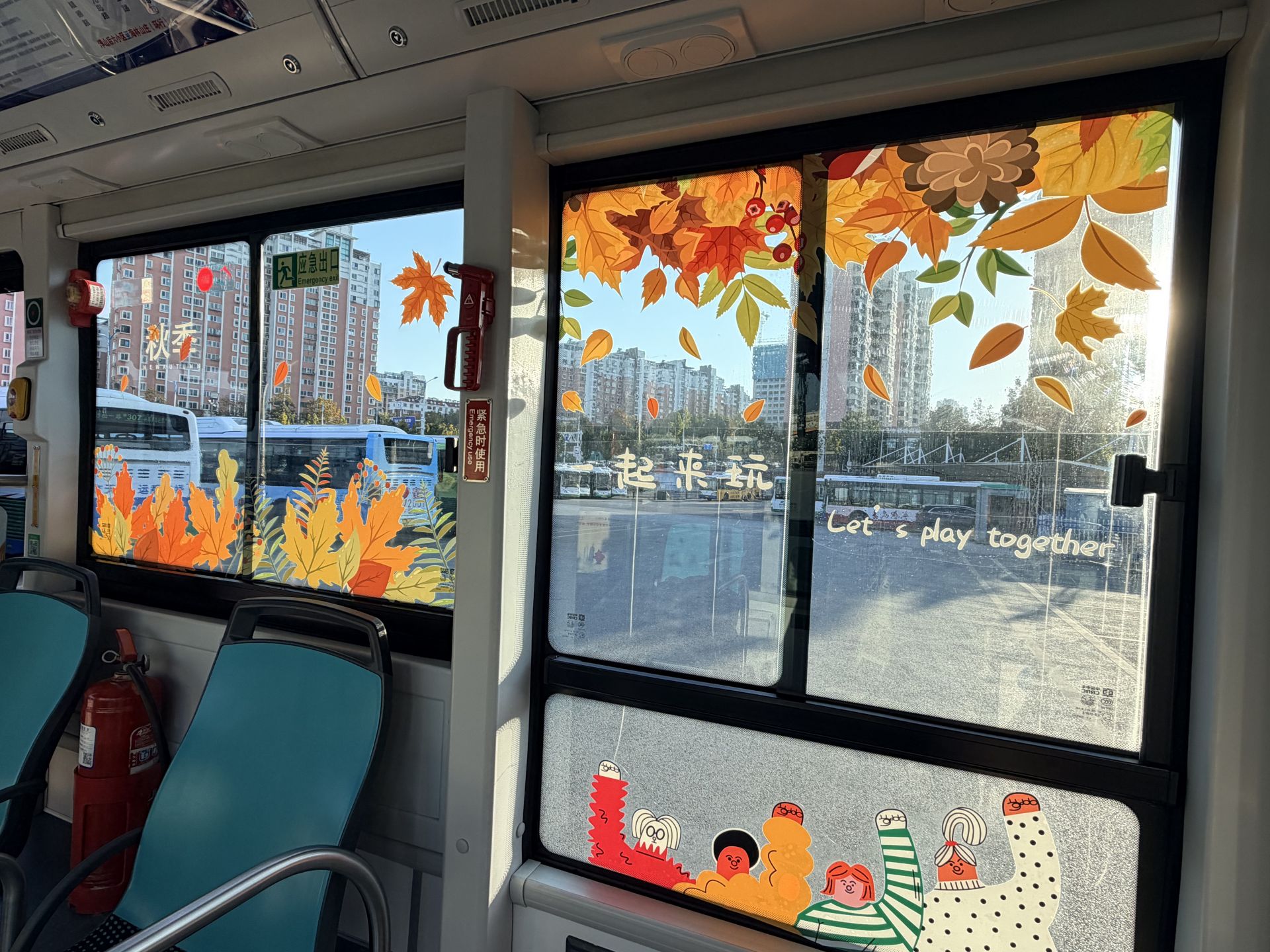 记者踏入环浮山公交的“秋日主题”车厢,瞬间便被浓郁的秋意所包裹。车窗玻璃上精心贴附的金黄落叶贴纸,在阳光映照下光影斑驳,与窗外流动的城市景致交织成一幅动态画卷。这巧妙的设计,让乘客在前往浮山森林公园的途中,便提前置身于山野林趣的诗意氛围里。