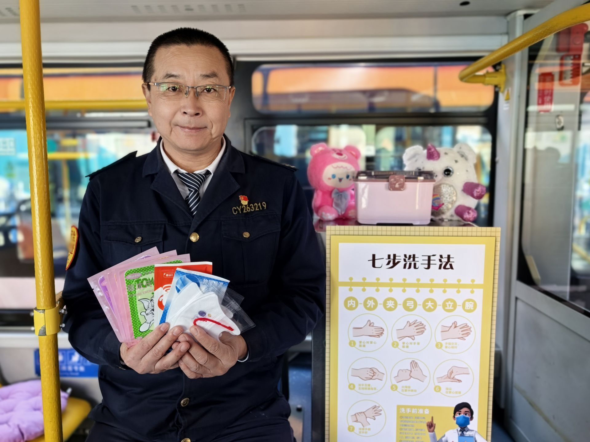 此外,车厢内还特意配备了实用的“冬季健康便民包”,成为守护乘客健康的“移动驿站”。便民箱内整齐摆放着一次性口罩、消毒湿巾、体温枪等防疫用品,以及创可贴、暖宝宝等应急物品,能够及时为有需要的乘客提供帮助。考虑到带孩子就医的家长群体,驾驶员杨绣武特意补充了儿童专用口罩和小玩具,既缓解孩子就医的紧张情绪,也为家长减轻了照料负担。