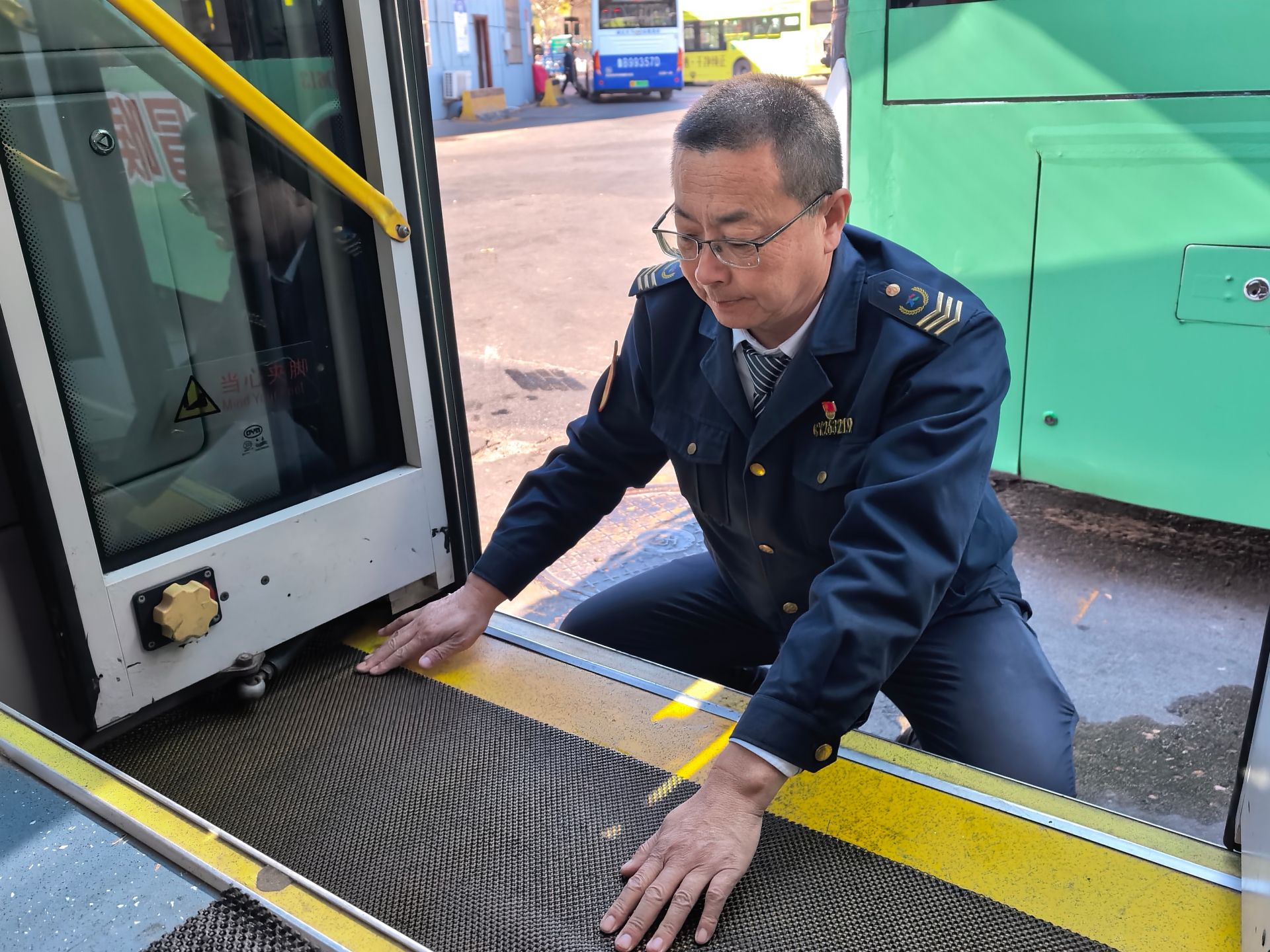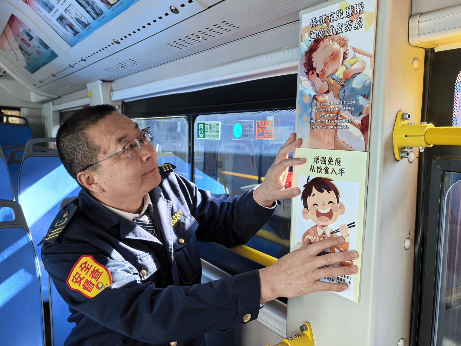 针对冬季路面湿滑的出行隐患,杨绣武在上下车门前铺设防滑地垫,从细节处筑牢安全防线。同时,考虑到天气寒冷,杨绣武把座椅铺上了软坐垫。他主动化身“健康引导员”,上车时提醒老年乘客坐稳扶好;遇到前往妇女儿童医院的乘客,还会细致告知下车后的步行路线及周边环境,用贴心服务为乘客的健康出行“加码”。“这趟车太贴心了,不仅有健康提示,还有应急物品,带着孩子去看病,心里都踏实多了。”一位带孩子乘车的乘客说道。