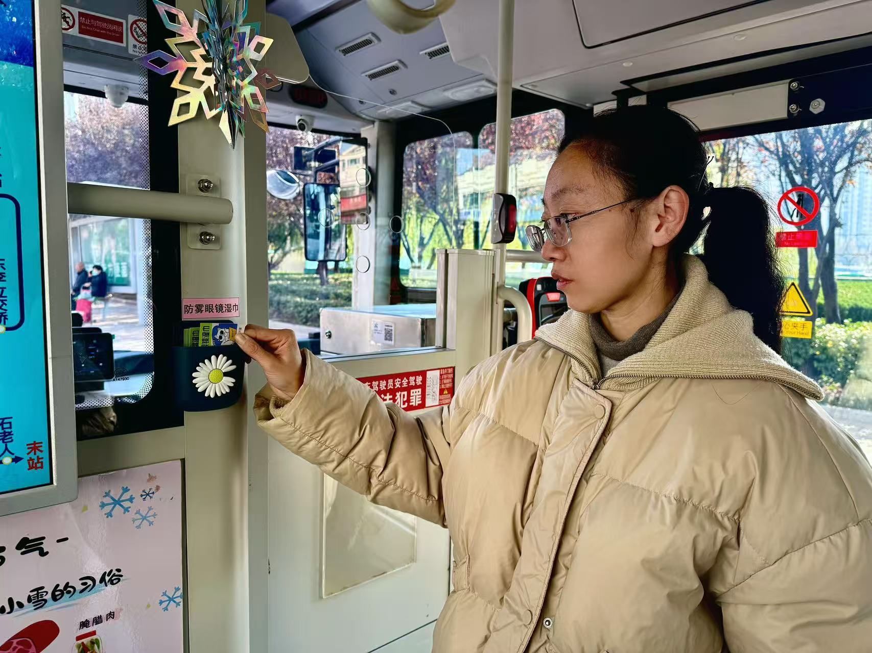 因室内外温差较大,崔立群还贴心准备了防雾眼镜湿巾,帮助戴眼镜的乘客解决上下车时镜片起雾的“小尴尬”。考虑到小雪节气后降雪可能性增加,为保证乘客的出行安全,崔立群未雨绸缪,在车厢内铺设了节气主题的防滑地贴,同时在扶手杆上设置了防滑套,确保雨雪天气乘客乘车安全。