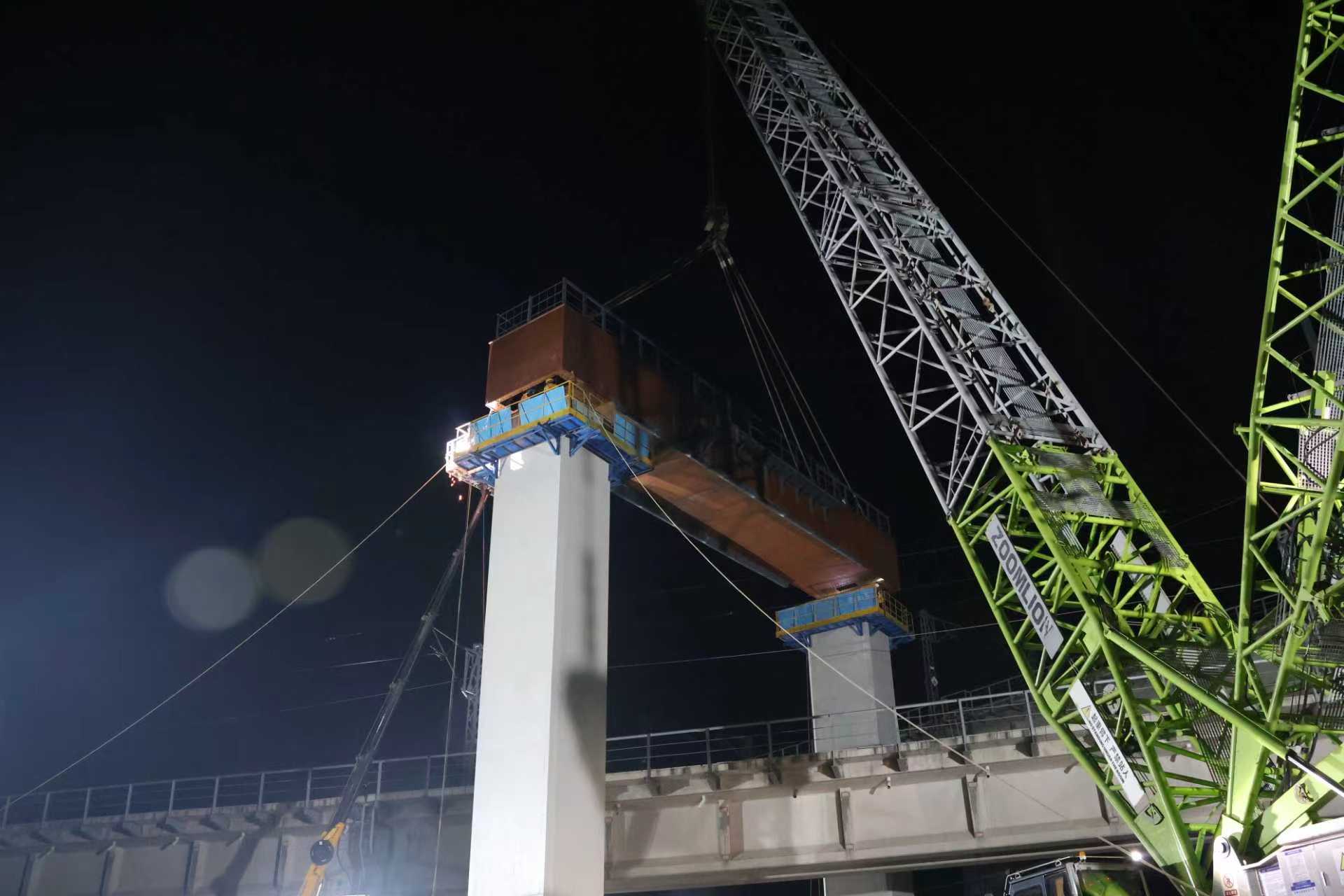 本次吊装的钢横梁跨度23米,重达118吨,上跨正在运营的青盐铁路。为在仅有的120分钟“施工天窗”内实现钢横梁与墩柱的毫米级对接,项目团队综合运用智能报警系统、BIM技术、智慧工地平台及高精度智能监测等数字化手段,构建起“人防、物防、技防”三位一体的安全防护体系,实现对施工全过程的风险预判与动态监控,将安装误差控制在5毫米以内,有效保障了跨线作业安全可控。