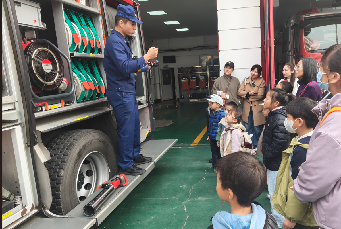 在参观过程中,消防救援人员用通俗易懂的语言向大家介绍了各类装备的参数性能、操作规程等方面的知识,详细介绍了各种车辆的战斗性能、随车器材以及主要功能用途,给学生们展示了各种器材的使用方法,部分学生带着满满的好奇登上消防车过了一把“消防瘾”。消防救援人员结合各类器材装备的特点重点讲解消防安全常识、逃生自救技巧,让学生们学习掌握自防自救、正确报警等基础知识。