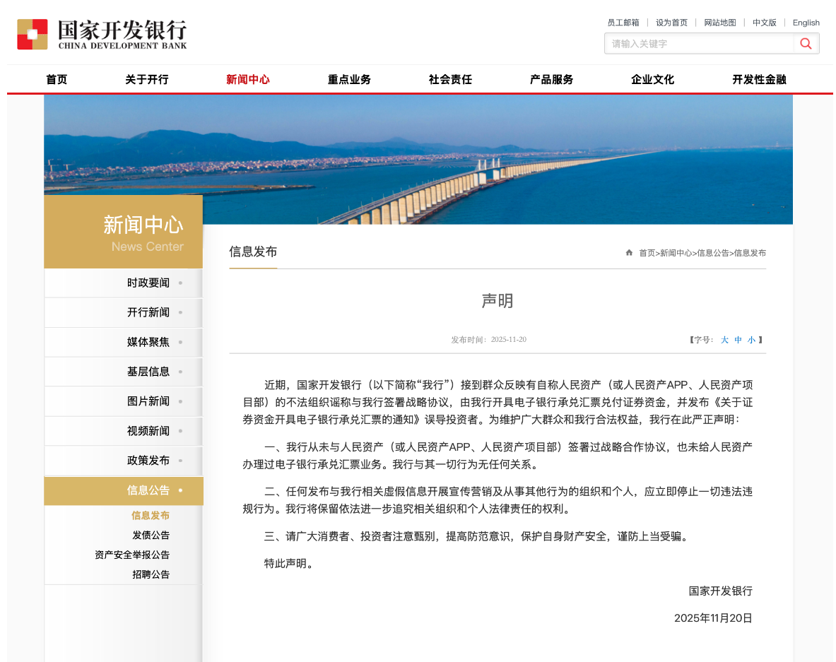 声明表示,近期,国家开发银行接到群众反映有自称人民资产(或人民资产App、人民资产项目部)的不法组织谣称与国家开发银行签署战略协议,由国家开发银行开具电子银行承兑汇票兑付证券资金,并发布《关于证券资金开具电子银行承兑汇票的通知》误导投资者。