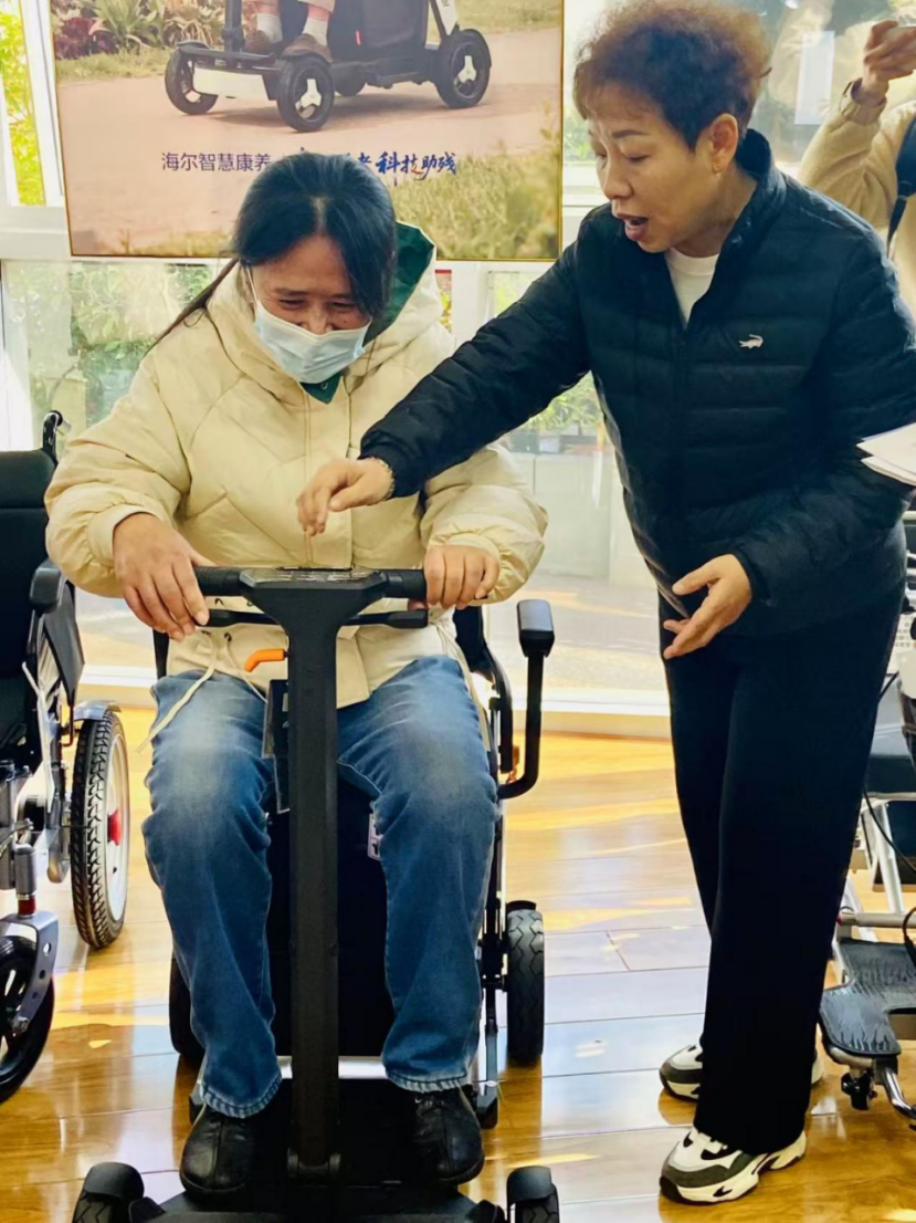 康复辅具与养老科技体验中心内更是人气爆棚。在工作人员的指导下,老人们纷纷体验智能护理床、康复理疗仪等产品。“这个智能手环既能测心率还能定位,以后出门子女也放心。”市北区双山街道的张阿姨戴着智能手环反复查看,工作人员还手把手教她如何连接手机查看数据。