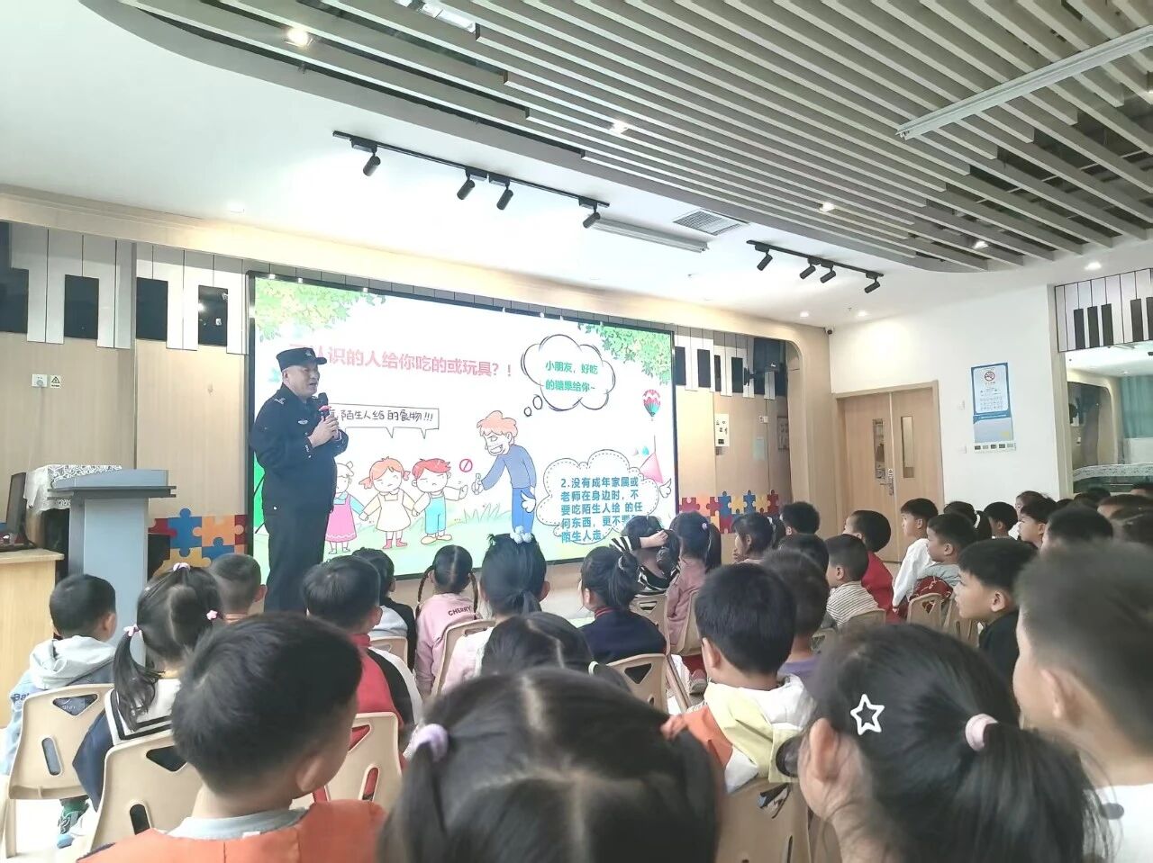 考虑到幼儿年龄小、认知能力有限的特点,民警精心设计了“趣味讲解+互动游戏”的教学模式,将陌生人常用的拐骗手段具象化呈现,让孩子们在亲身体验中掌握拒绝陌生人的正确方式。