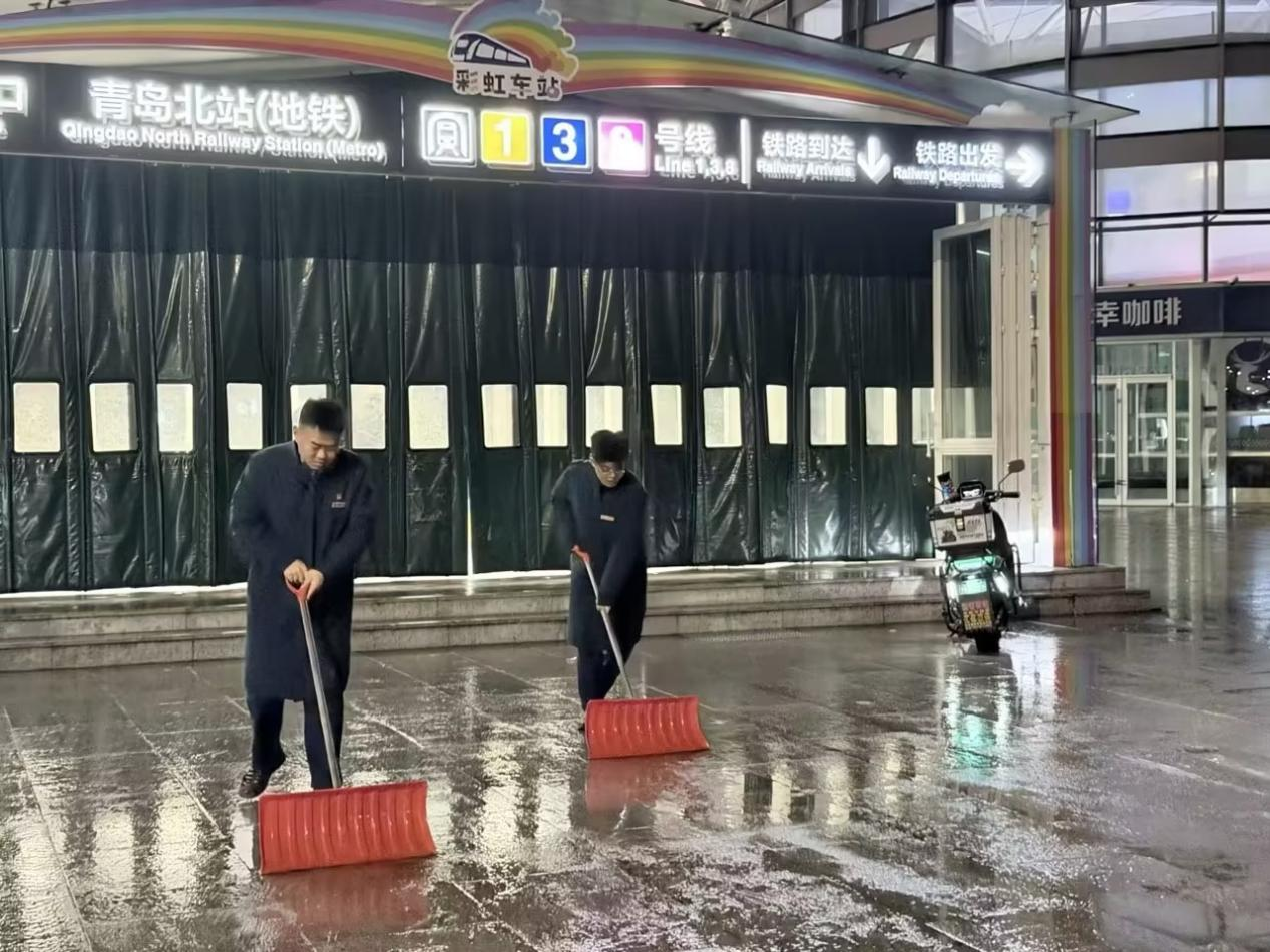 青岛北站迅速开展站外扫雪除冰作业,全力清除通行障碍。