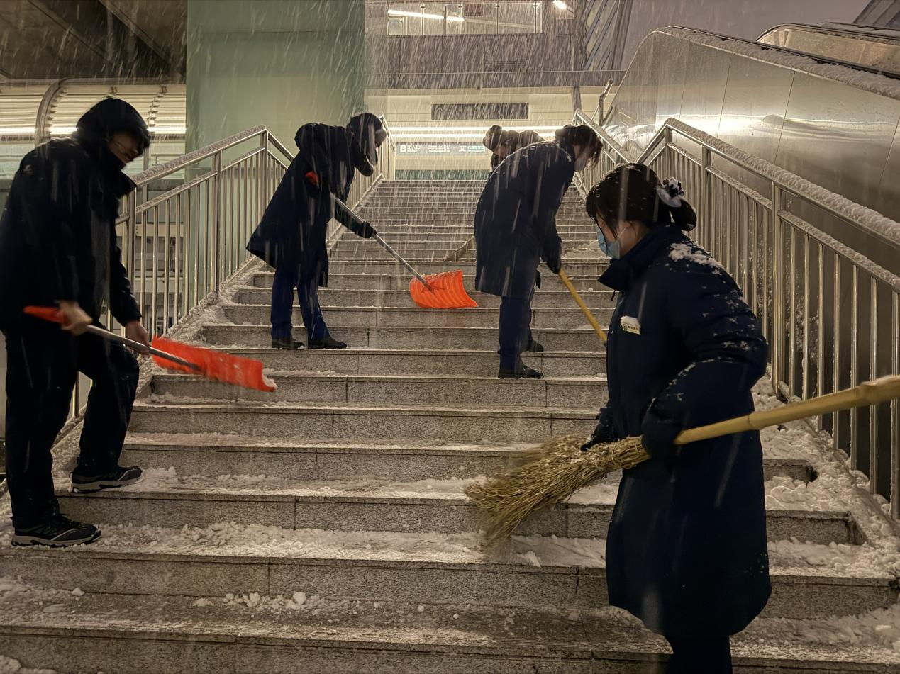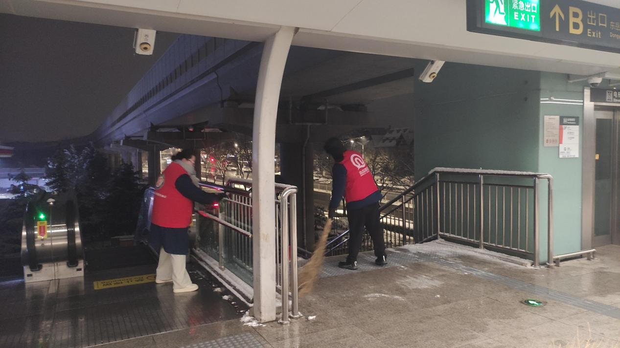 凤凰山路站班组全员对楼扶梯上的积雪进行清理。