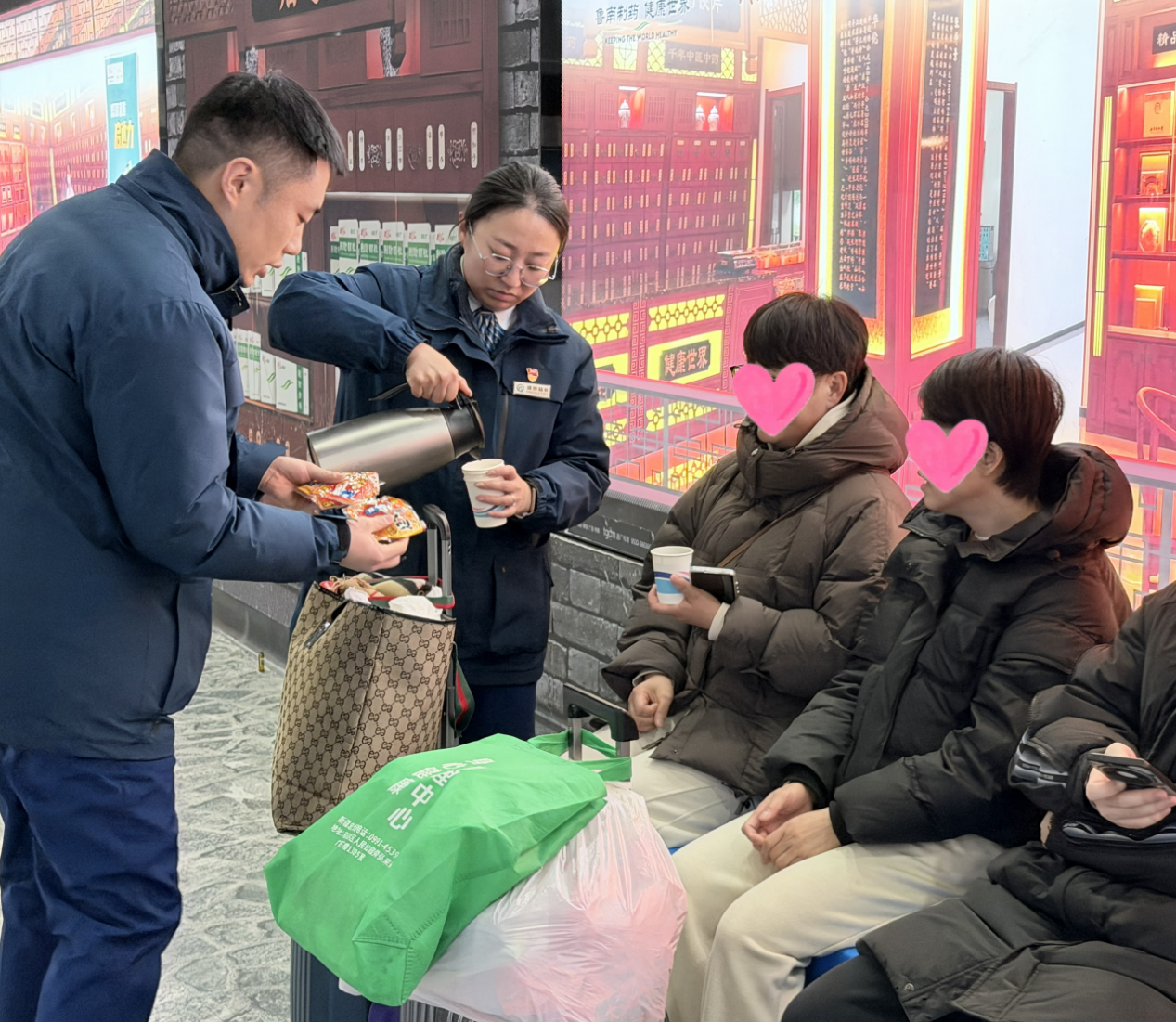 青岛北站为刚下火车的乘客送上姜茶、暖贴。