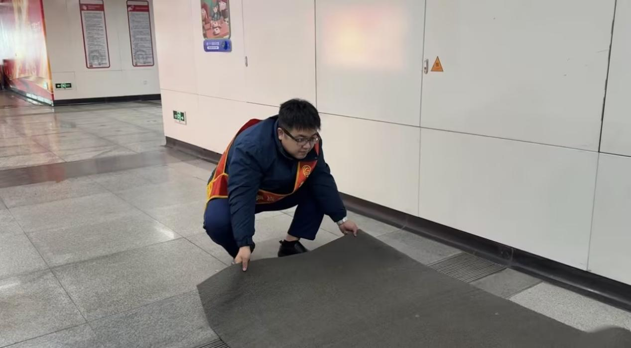 五四广场站第一时间在出入口、站厅通道关键区域铺设防滑垫。