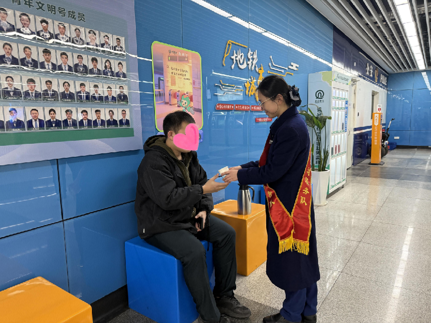 五四广场站新增休息凳,为避寒乘客打造舒适休憩角,并贴心送上热水。