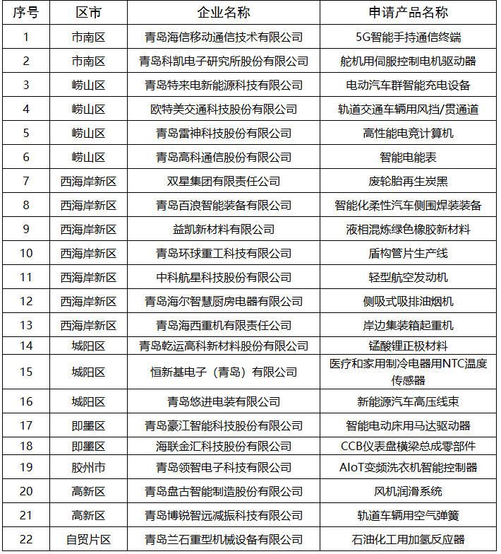 记者从青岛市工业和信息化局获悉,近日,山东省工业和信息化厅公布了第九批山东省制造业单项冠军企业和第三、六批复核通过企业名单,青岛市共有22家企业入选第九批山东省制造业单项冠军(见附件),28家企业通过复核。截至目前,青岛市累计培育山东省制造业单项冠军企业128家,总数和增量均位居全省前列。