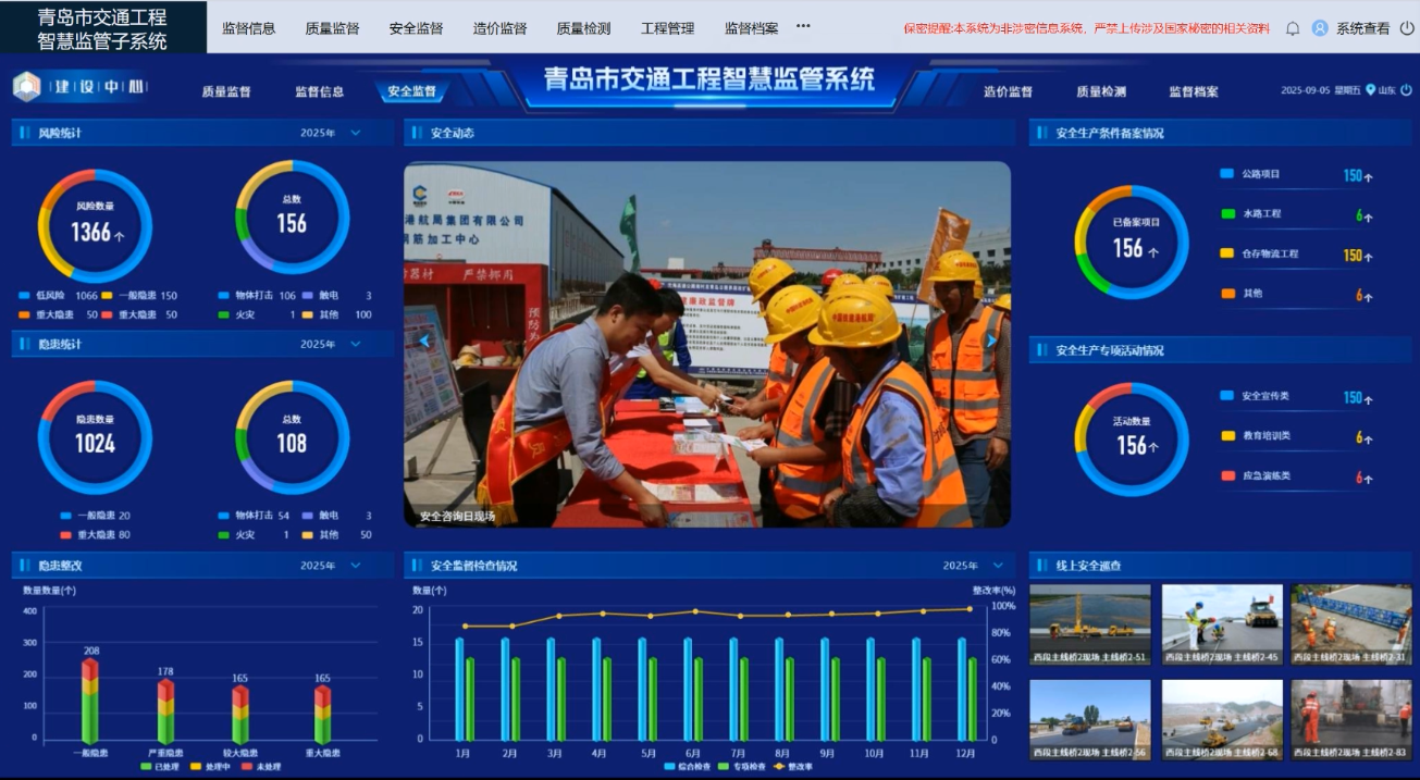创新安全监管标准化,以《青岛市交通工程质量和安全生产监督管理办法》为核心,配套《青岛市交通工程建设安全监督检查指南》《交通工程危险作业管理办法》《青岛市交通工程安全监管清单式动态工作手册》等3项制度和N项实施细则,建立安全“1+3+N”标准体系,小到沥青路面铺设厚度,大到桥梁桩基施工标准,都有明确规范,让工程建设“有章可循、有据可依”。在此基础上形成的《标准引领、数智驱动、生态协同》新型基建体系案例入选省交通强国山东示范区建设办公室创新案例和市委改革办创新案例。