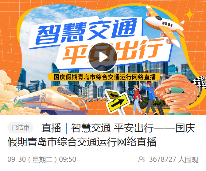 面向公众,拓展群众出行服务功能。针对群众对交通服务的新需求,打造一体化、多层次特色信息服务产品,在全省率先建立地级市交通出行服务平台和“爱山东”交通板块,组织“数字主播+真人主播”交通直播15次,总观看人数超4100万。开放打造“交通+”服务模式,“交通+旅游”实现地铁沿线30余个景区数字化导览全覆盖。