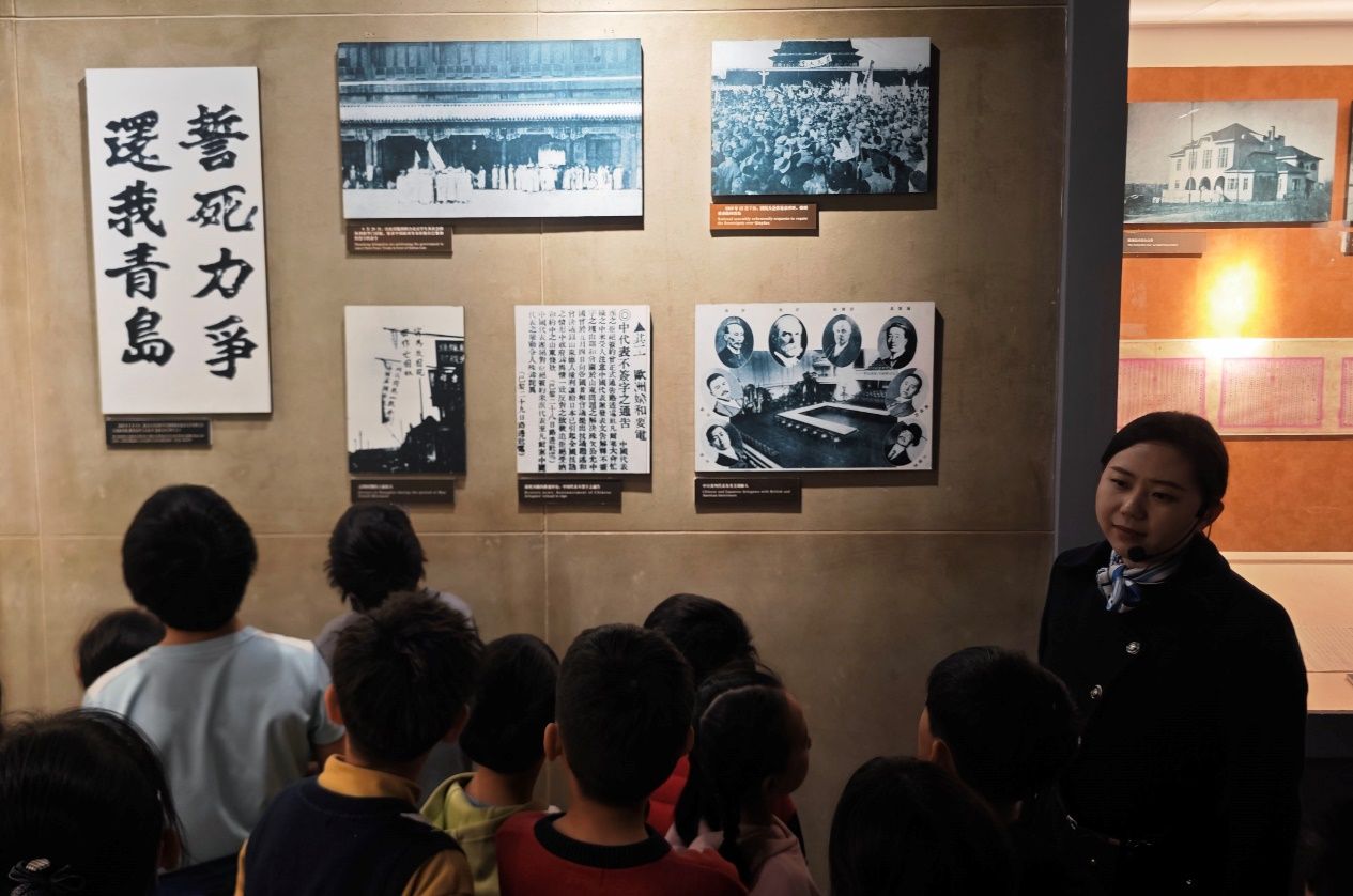 “收回青岛”展区前,气氛格外凝重。讲解员老师深情讲述着先辈们为收回主权付出的艰辛努力,从五四运动中爱国学子的呐喊到各界人士的奔走抗争,一段段波澜壮阔的历史呈现在小记者面前。