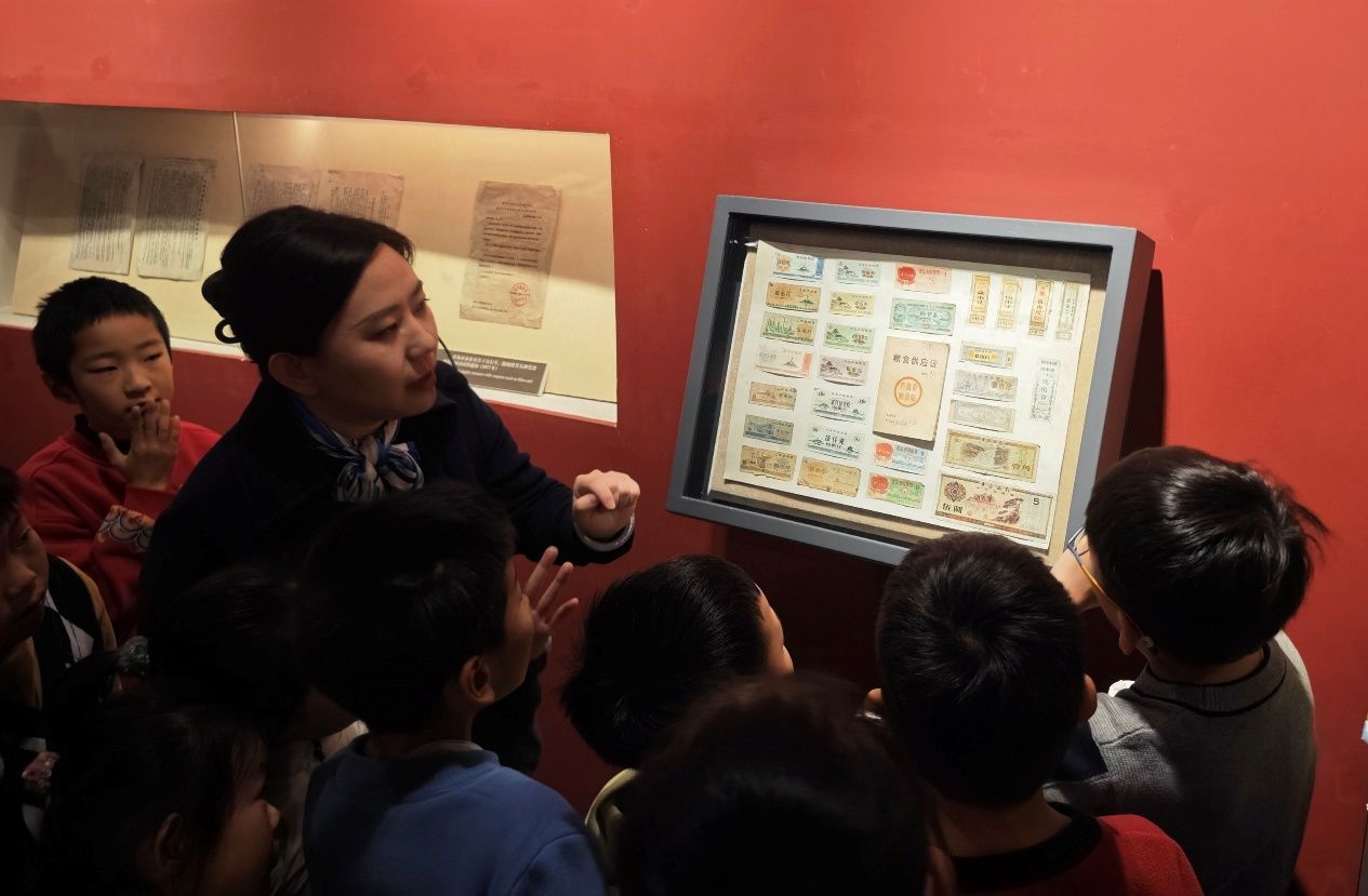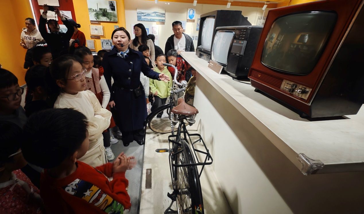 最让小记者感兴趣的是“老青岛百态”板块。上个世纪70年代结婚“三大件”——自行车、手表、缝纫机,还有粮票、里院风情照片、中山路老字号招牌,这些充满市井烟火气的展品让孩子们感受到了祖辈生活的智慧与温度。“原来以前的电视是黑白的,大金鹿自行车的刹车在后面,因为青岛上下坡多,这样更安全。”讲解老师的细致解读让历史变得亲切可感,小记者围在展柜旁,一边观察一边提问,现场互动气氛热烈。