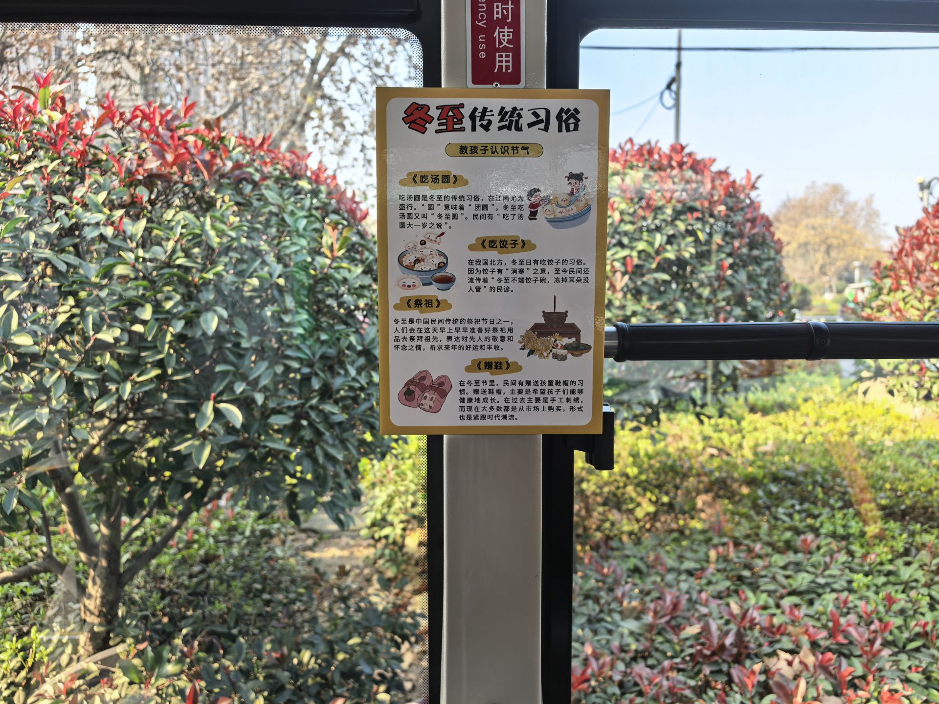 走进408路公交车,浓厚的冬至氛围扑面而来。车厢内精心布置的主题展板格外醒目,展板以图文并茂的形式,详细介绍了冬至节气的起源、气候特点、养生常识以及本地冬至时节吃饺子、煮汤圆等特色习俗,让乘客在乘车间隙轻松了解传统节气知识,沉浸式体验“移动文化课堂”的独特魅力。