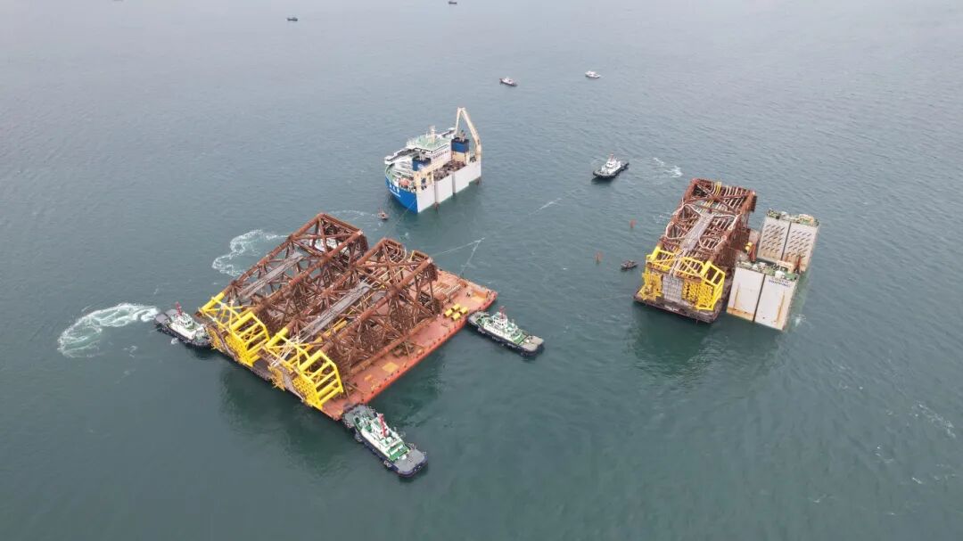 此次浮装的三艘无动力驳船,总长108米,总宽37米,均载有近10层楼高的大型导管架,重量10000多吨。作业面临多重挑战:冬季恶劣海况影响显著,寒潮频繁、作业窗口期极短。加之无动力驳船自身无操控能力,受风流作用明显,船舶稳定性控制难度极大。同时,作业空间与精度要求极高,三艘驳船均装载大型导管架,尺寸庞大、重心高,浮装过程中需确保驳船与半潜船甲板精准对接,任何细微偏差都可能引发碰撞风险。此外,多船协同作业复杂,无动力驳船完全依赖拖轮协助,在有限的锚地水域内,需统筹拖轮、半潜船和驳船的动态配合,对引航团队的整体协调与应急能力提出严峻考验。