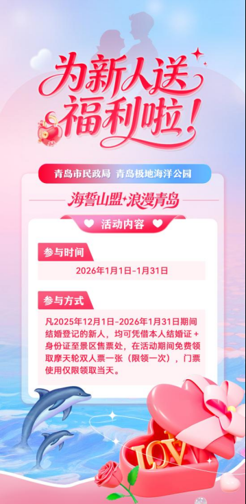 本次“海誓山盟·浪漫青岛”甜蜜公益行时间为2026年1月1日至1月31日,凡是于2025年12月1日至2026年1月31日期间办理结婚登记的新人,均可凭借本人结婚证与身份证至景区售票处,在活动期间免费领取摩天轮双人票一张(限领一次),门票使用仅限领取当天。