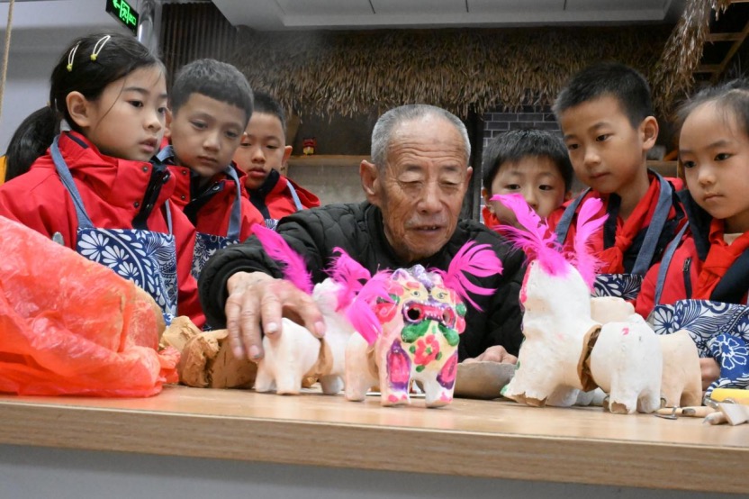 “泥老虎的嘴部和眼睛要用黑色来表现;老虎的额骨、鼻子和口表现为红色以示喜庆和威严。” 12月23日,在山东省青岛市即墨区创智实验学校的泥塑教室里,非遗传承“守”艺人于正寿正在给孩子们介绍如何给泥老虎上色。