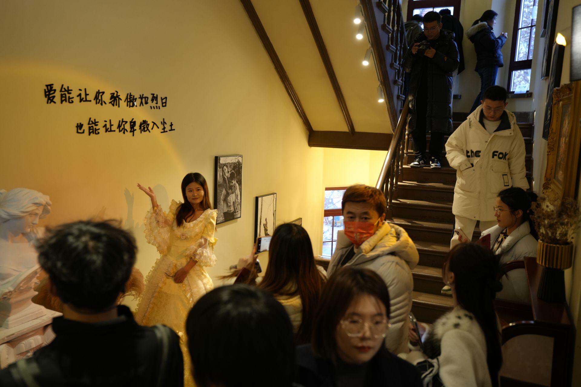 当浪漫场景与冬日消费相遇,年轻人的爱情故事在市集中缓缓铺开。走进百年老建筑,热咖啡、热可乐的温度与香气交织。青年们戴上象征身份的单身手环,在“好友互助机制”掩护下,自然而然地开启话题。NPC互动、角色扮演、现场乐队驻唱,则让空间始终保持在热闹状态。