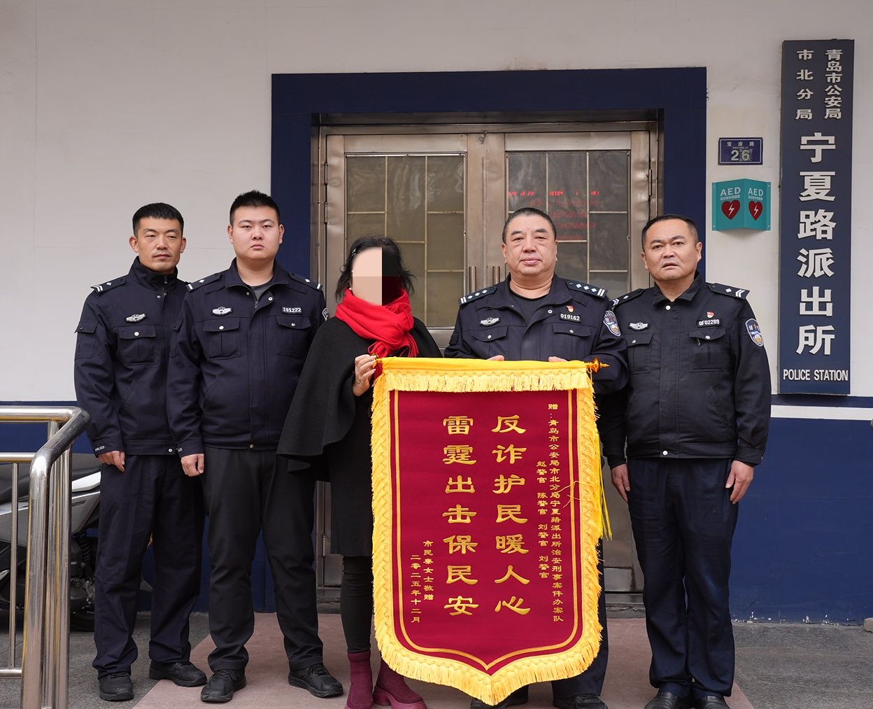 12月22日上午,秦女士手捧一面锦旗,来到宁夏路派出所表达谢意。锦旗上“反诈护民暖人心、雷霆出击保民安”14个金黄大字,在冬日阳光下格外温暖耀眼。
