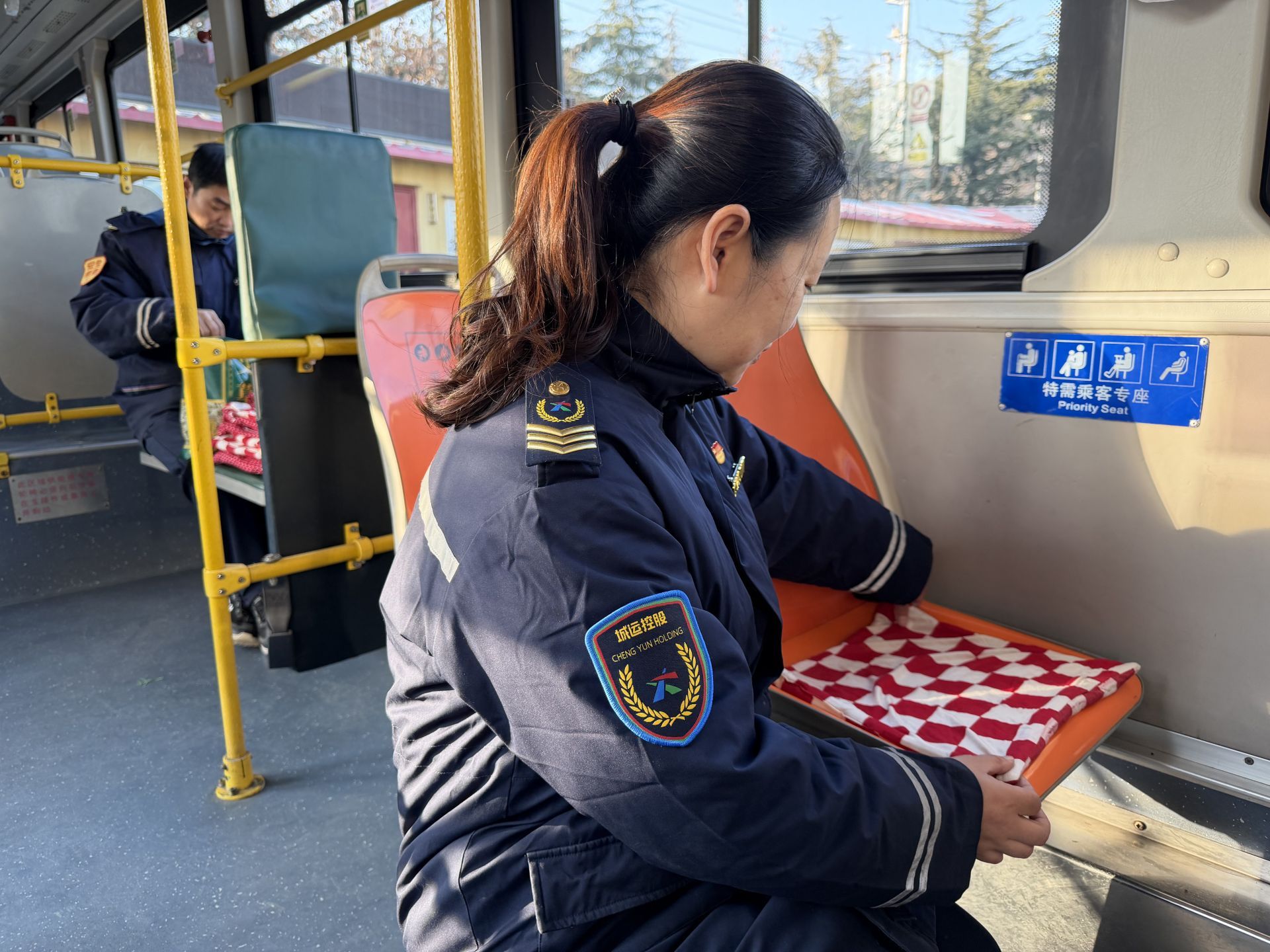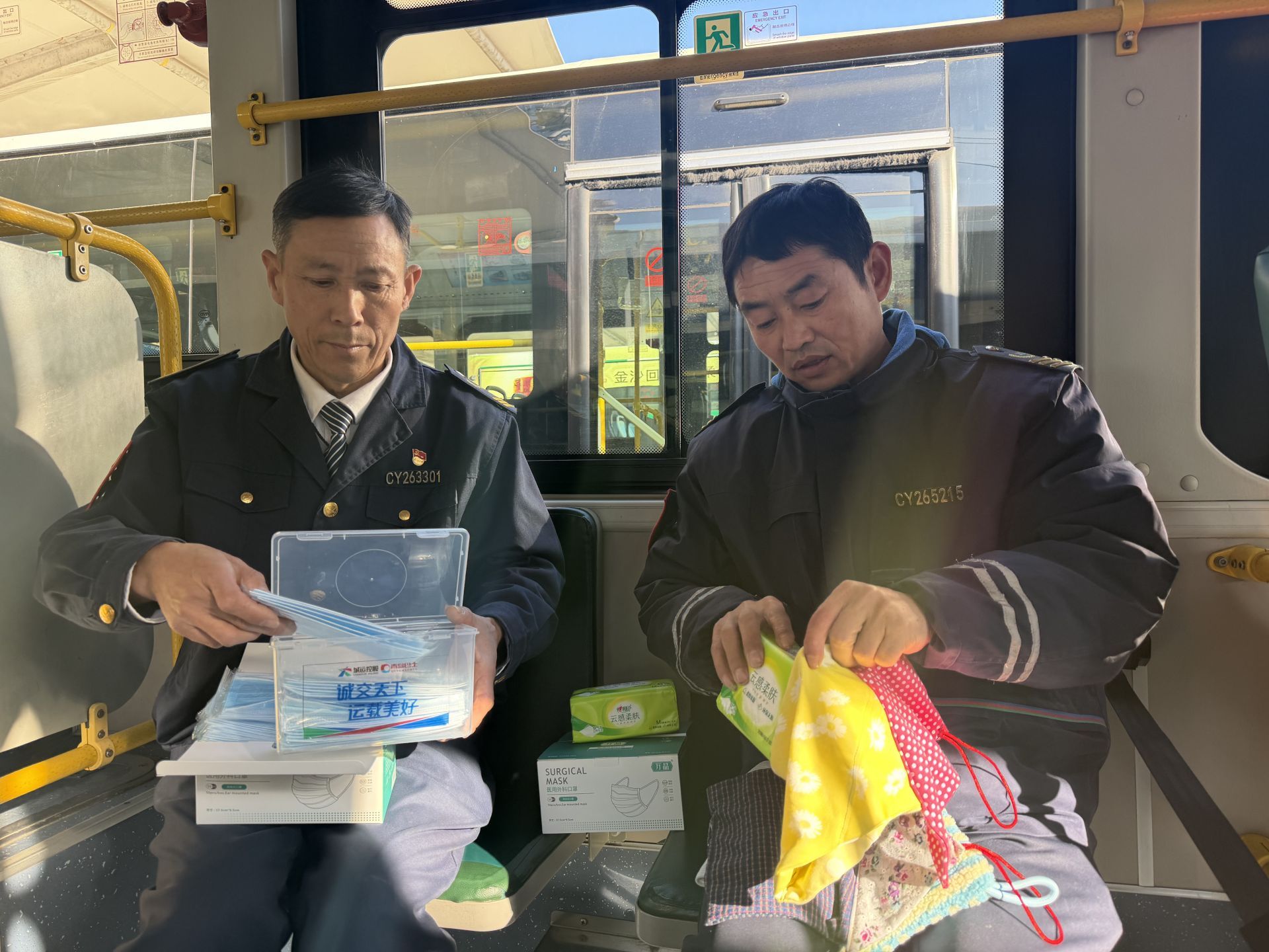 郑吉凡作为389路特需服务队的一员,他的暖心贡献远不止于协助制作坐垫。他一直默默关注着车厢内乘客的细微需求,比如乘客有使用纸巾的需要、遇到突发情况时忘记携带口罩。于是,他自掏腰包购置了抽纸和口罩,整齐地放置在车厢内设置的便民服务角。“这些花不了多少钱,但能在关键时刻帮乘客解决一点小麻烦,我觉得很值。”郑吉凡话语中透着关怀。