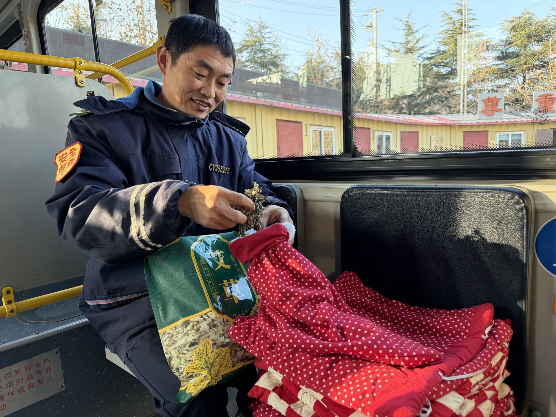 车辆换代,初心不变。随着城市绿色出行体系的不断完善,今年389路迎来了一次重要的“大升级”——全线车辆由天然气车更换为更环保的天然电新能源电车。车辆的舒适性与环保性显著提升,但冬季车厢座椅的触感冰凉问题,尤其是对于许多老年乘客而言,依然是陈海峰心中的牵挂。“新车密封性好,但座椅材质本身还是凉,光有原来的棉花垫恐怕不够。”一次偶然的机会,陈海峰了解到艾草具有驱寒保暖的功效,一个为坐垫“升级换代”的想法便在他心中萌生。