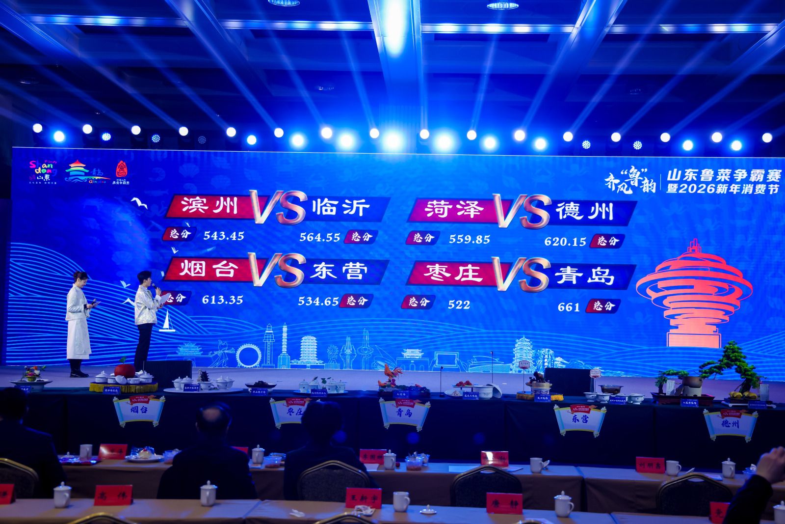 作为本次活动的核心亮点,鲁菜争霸赛汇聚全省16市顶级厨师战队,将在12月26日至28日三天内展开预赛、八强赛、决赛三轮4场巅峰对决,最终角逐金银铜牌,同步评选最佳口味、最佳创意、最佳人气三大特色奖项。开幕式后首场预赛即刻开战,八支地市战队两两比拼、各展绝技,经两轮激烈角逐,青岛、临沂、德州、烟台四支战队脱颖而出率先晋级四强,滨州、菏泽、东营、枣庄战队斩获“优秀菜品奖”,精湛厨艺引得现场观众连连叫好。